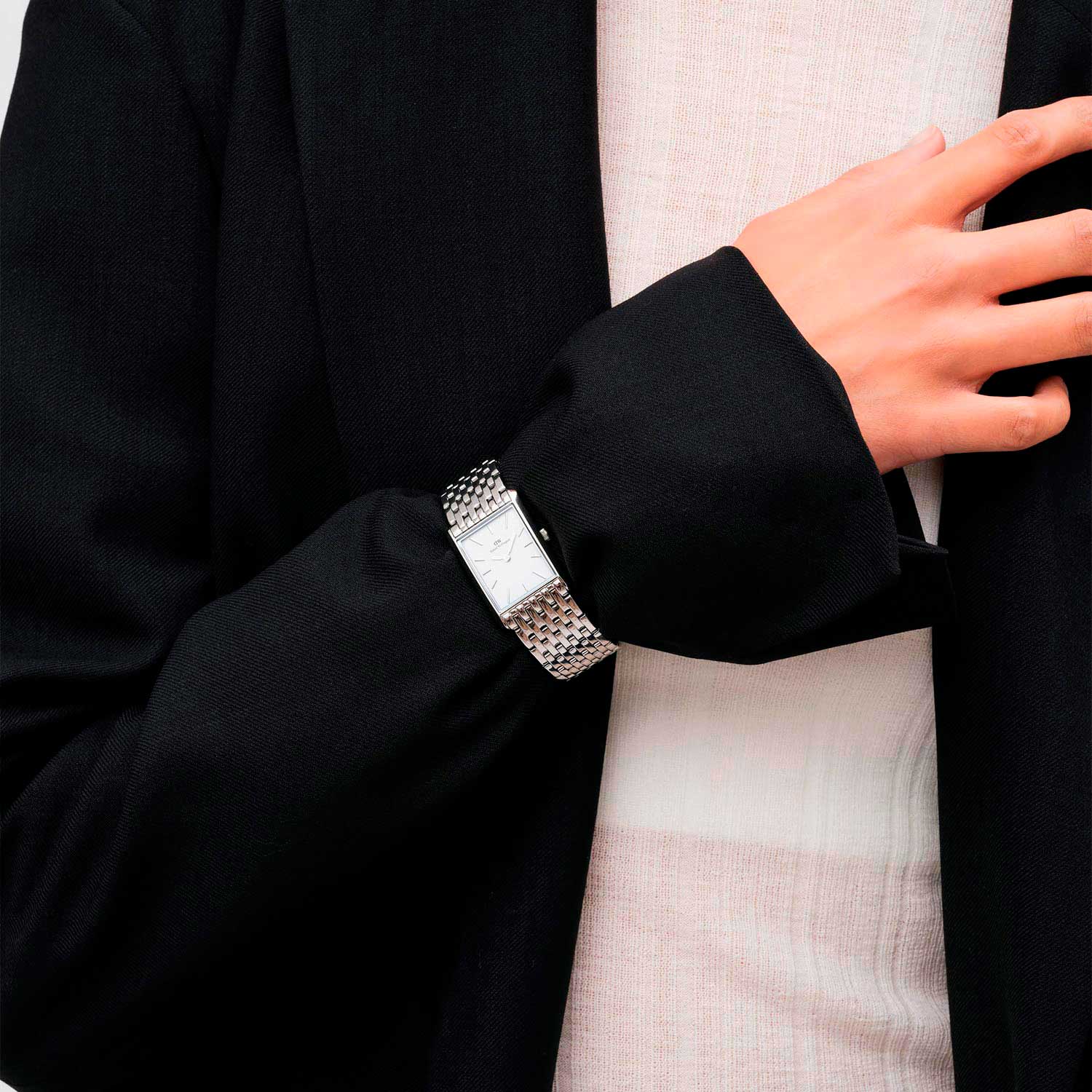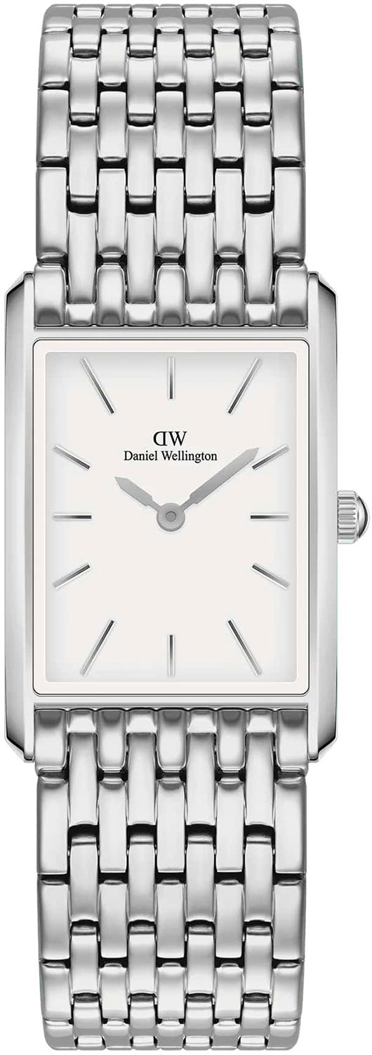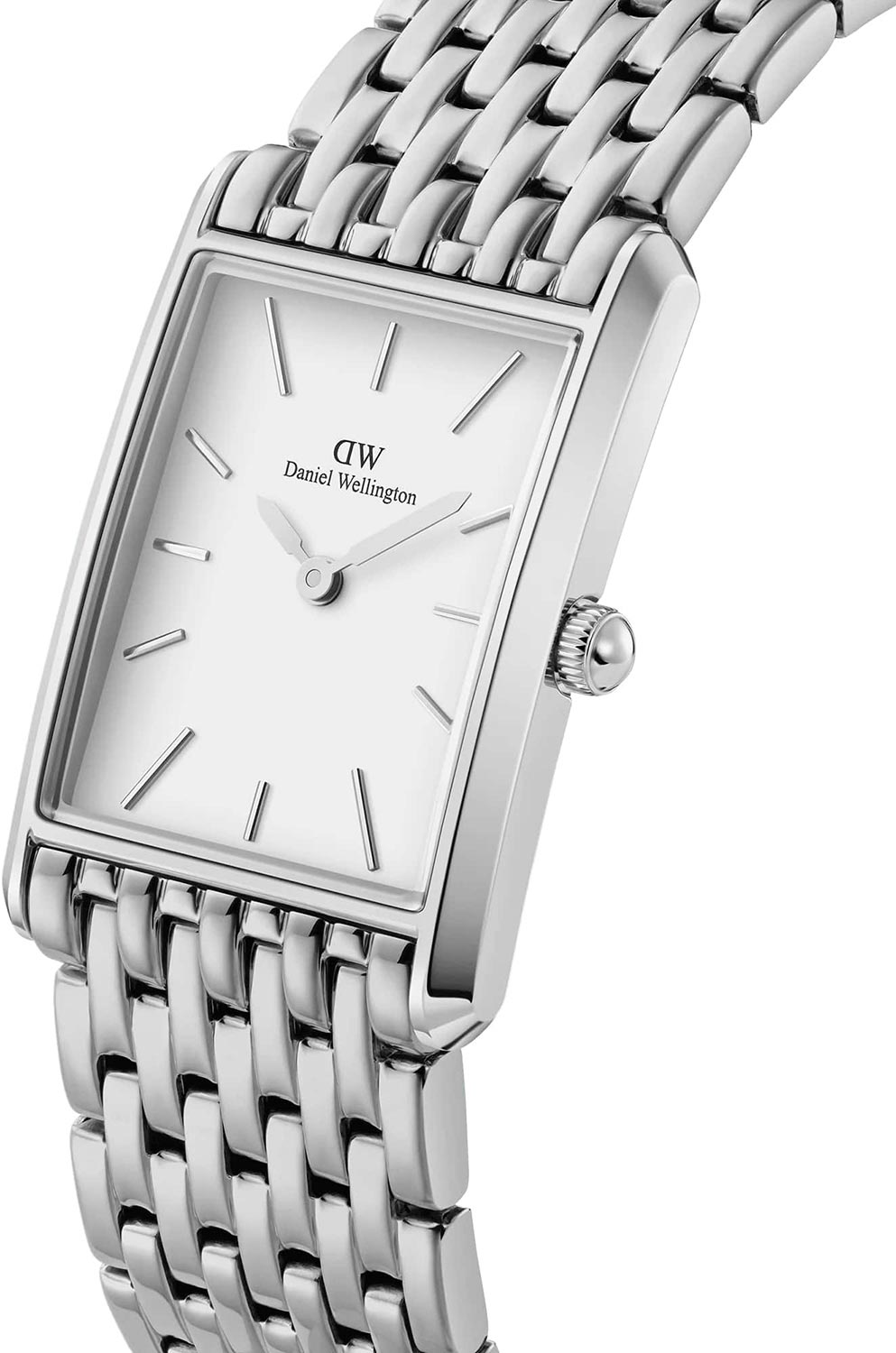 Изысканные классические часы с прямоугольным корпусом. Строгий дизайн подчеркивает их сдержанный и целостный характер. Женские наручные часы Bound 9-Link Silver. Стальной изогнутый прямоугольный корпус. Матовый циферблат украшен фирменным логотипом Daniel Wellington. Накладные метки в виде штрихов. Японский кварцевый механизм. Рифленая заводная головка. Стальной браслет с полированной отделкой. Раскладывающаяся застежка.