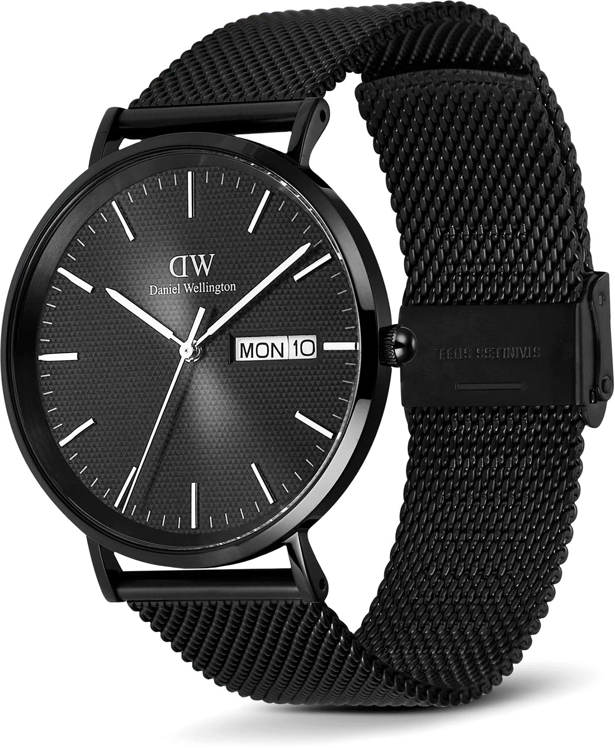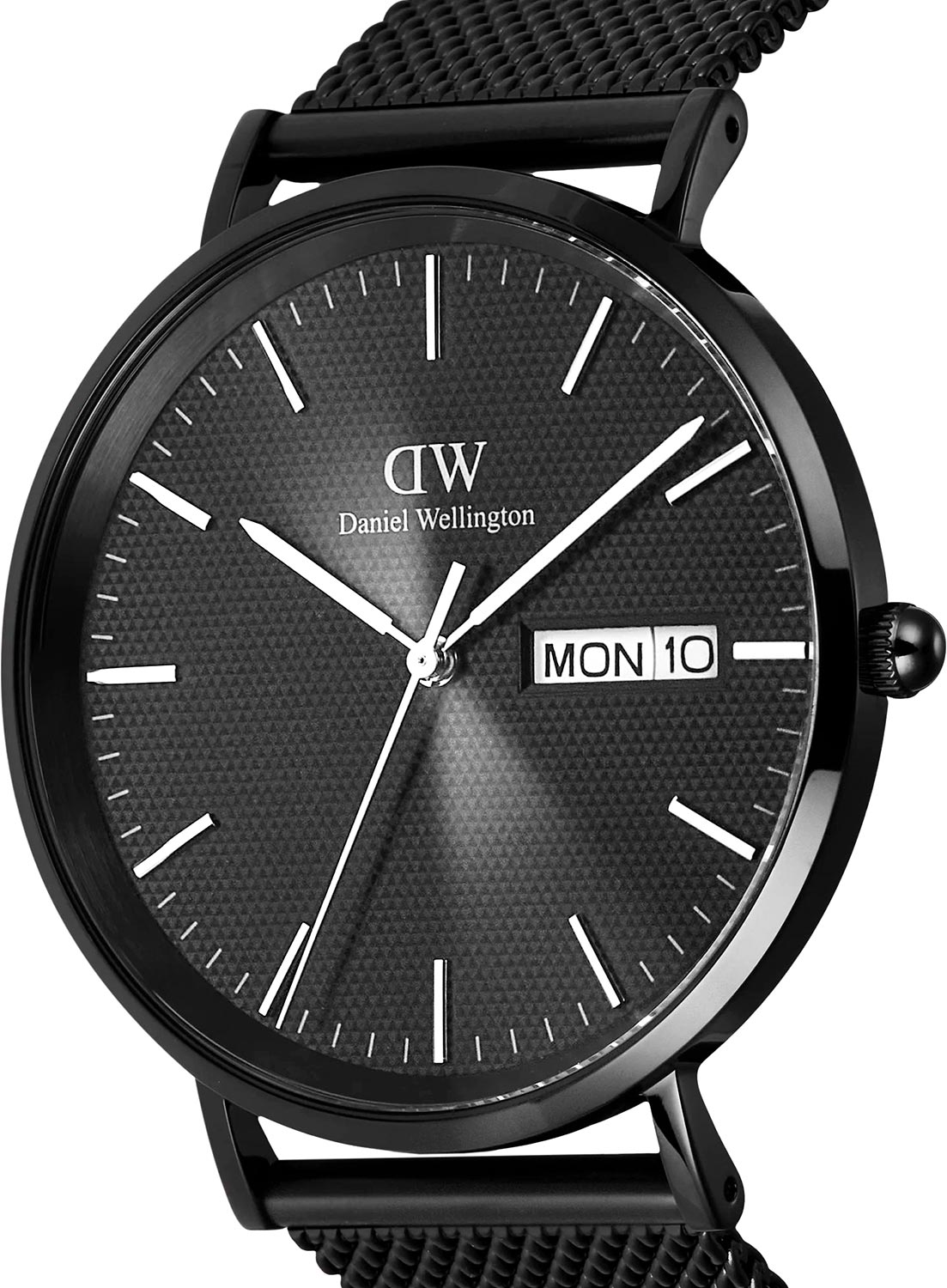 Наручные мужские часы Classic Day Display Onyx Black. Круглый полированный стальной корпус. Японский кварцевый механизм. Циферблат с треугольным узором выполнен по технологии Sunray (солнечные лучи) и дополнен фирменным логотипом Daniel Wellington. Накладные метки в виде штрихов. Окошко даты и дня недели находится в положении 3 часов. Внутренний матовый безель между стеклом и циферблатом. Рифленая заводная головка. Надежный и удобный браслет миланского плетения с регулируемой застежкой.
