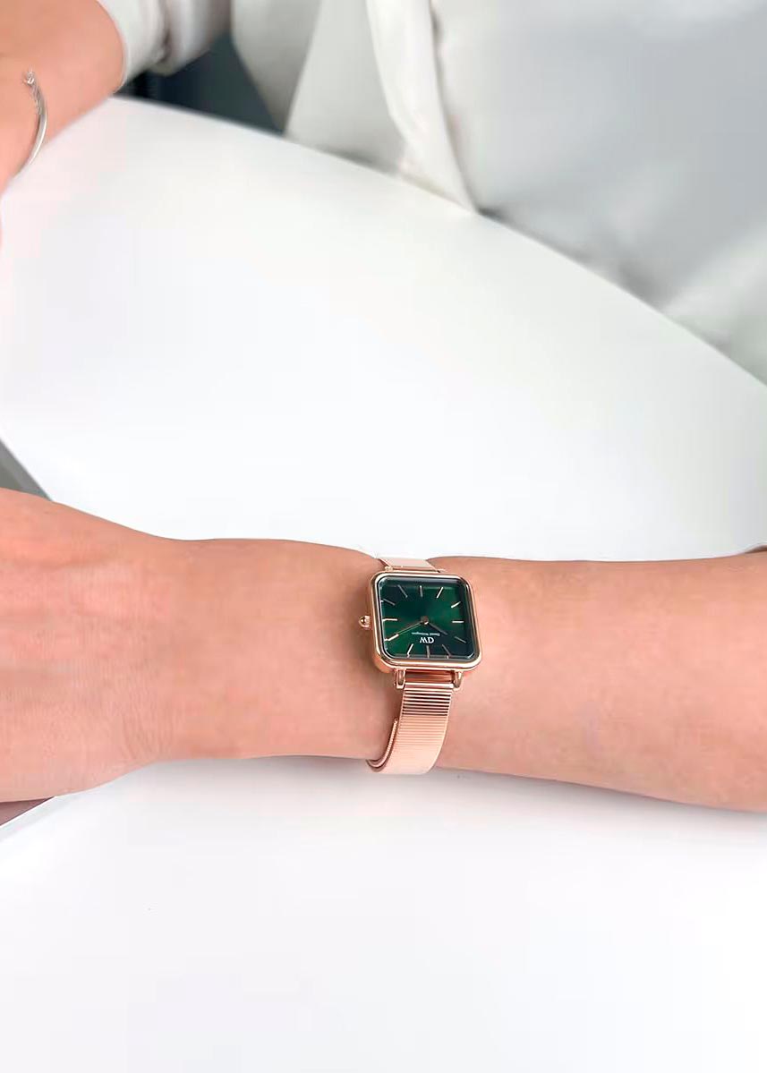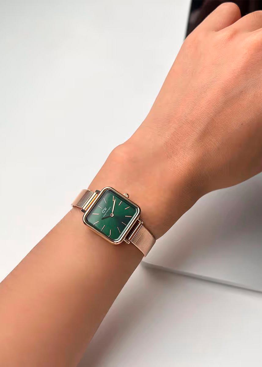 Женские наручные часы Quadro Studio Emerald Rose Gold с квадратным корпусом. Циферблат выполнен по технологии Sunray (солнечные лучи) и украшен фирменным логотипом Daniel Wellington. Накладные метки в виде штрихов. Японский кварцевый механизм. Рифленая заводная головка. Стальной браслет.