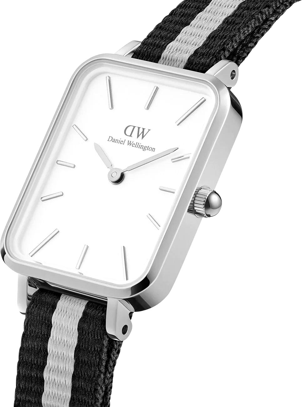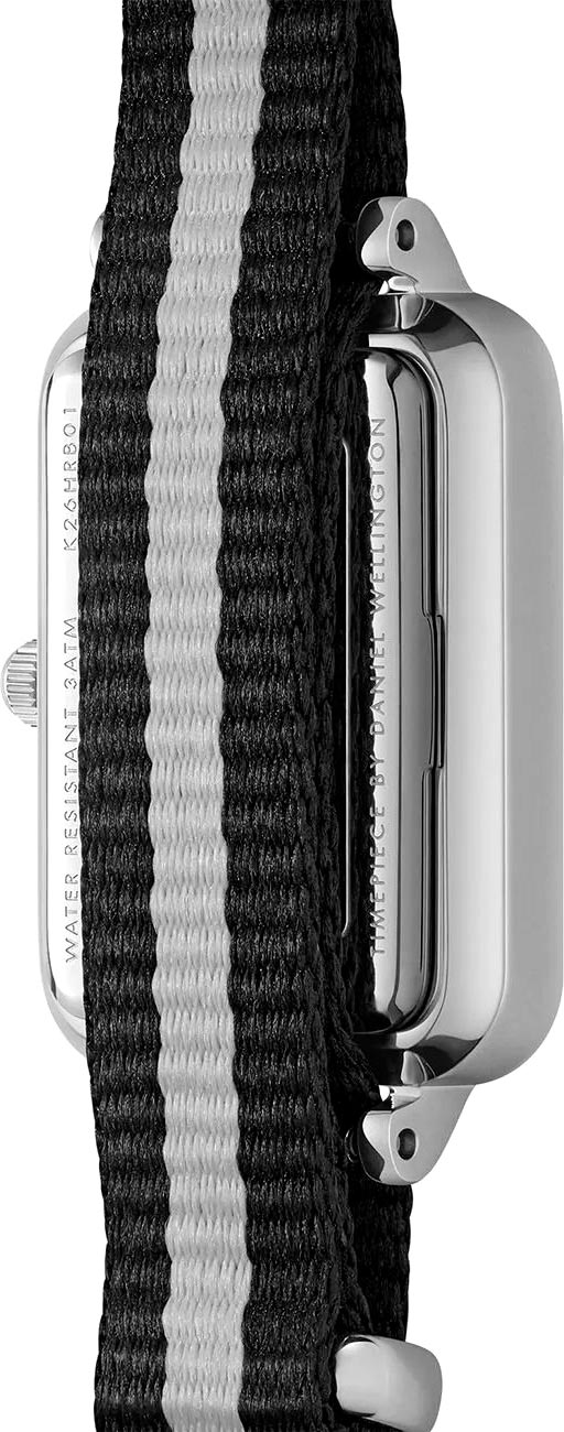 Наручные женские часы Quadro Charcoal с прямоугольным корпусом. Матовый циферблат украшен фирменным логотипом Daniel Wellington. Накладные метки в виде штрихов. Японский кварцевый механизм. Рифленая заводная головка. Нейлоновый ремешок. Застежка серебристого цвета.
