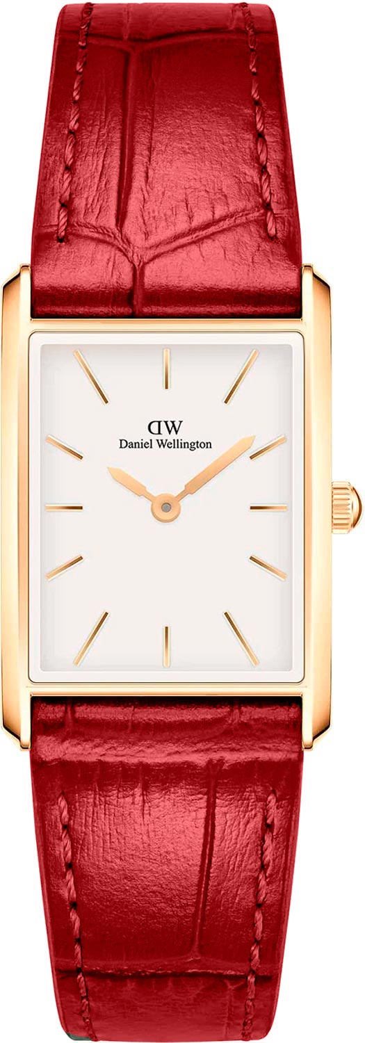 Женские наручные часы Bound Red Crocodile Rose Gold. Стальной прямоугольный корпус. Японский кварцевый механизм. Матовый циферблат украшен фирменным логотипом Daniel Wellington. Накладные метки в виде штрихов. Секундная стрелка отсутствует. Рифленая заводная головка. Ремешок из натуральной кожи с тиснением под кожу крокодила и классической застежкой.