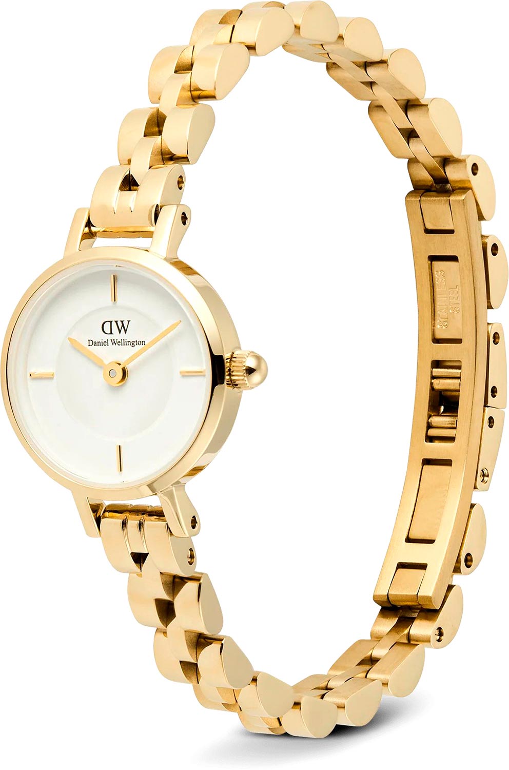 Женские наручные часы Petite Mini Arch White Gold в круглом полированном корпусе из нержавеющей стали. Японский кварцевый механизм. Циферблат выполнен по технологии Sunray (солнечные лучи) и украшен фирменным логотипом Daniel Wellington. Накладные метки в виде штрихов. Рифленая заводная головка. Утонченный стальной браслет с раскладывающейся застежкой.