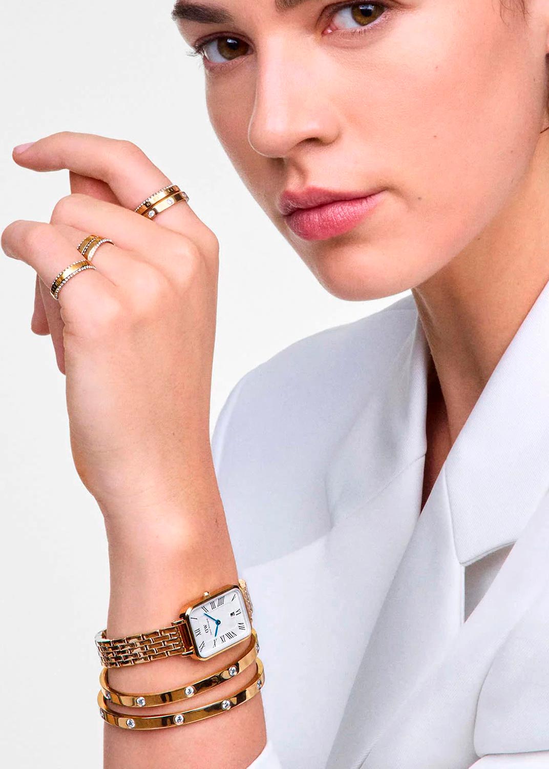 Классические наручные женские часы Quadro Roman Numerals Date Gold. Прямоугольный стальной полированный корпус. Матовый циферблат с легким текстурным узором в центре, украшен фирменным логотипом Daniel Wellington. Тонкие римские метки. Синие стрелки. Японский кварцевый механизм. Окошко даты находится в положении 6 часов. Рифленая заводная головка. Стальной браслет с раскладывающейся застежкой.