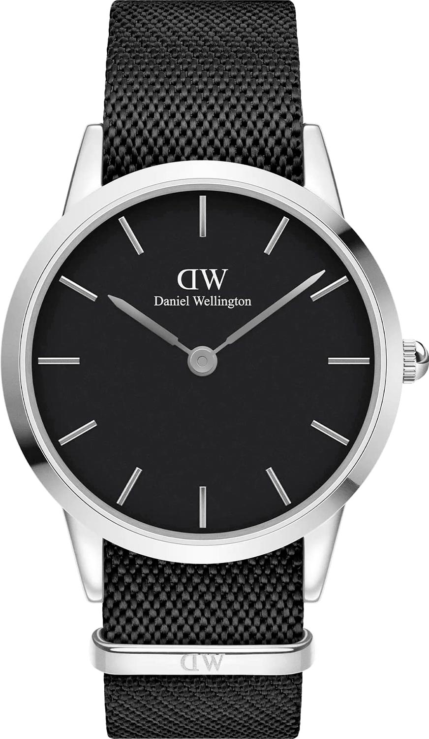 Наручные мужские часы Iconic Black NATO в круглом стальном полированном корпусе. Матовый циферблат украшен фирменным логотипом Daniel Wellington. Накладные метки в виде штрихов. Японский кварцевый механизм. Рифленая заводная головка. Нейлоновый ремешок. Застежка серебристого цвета.