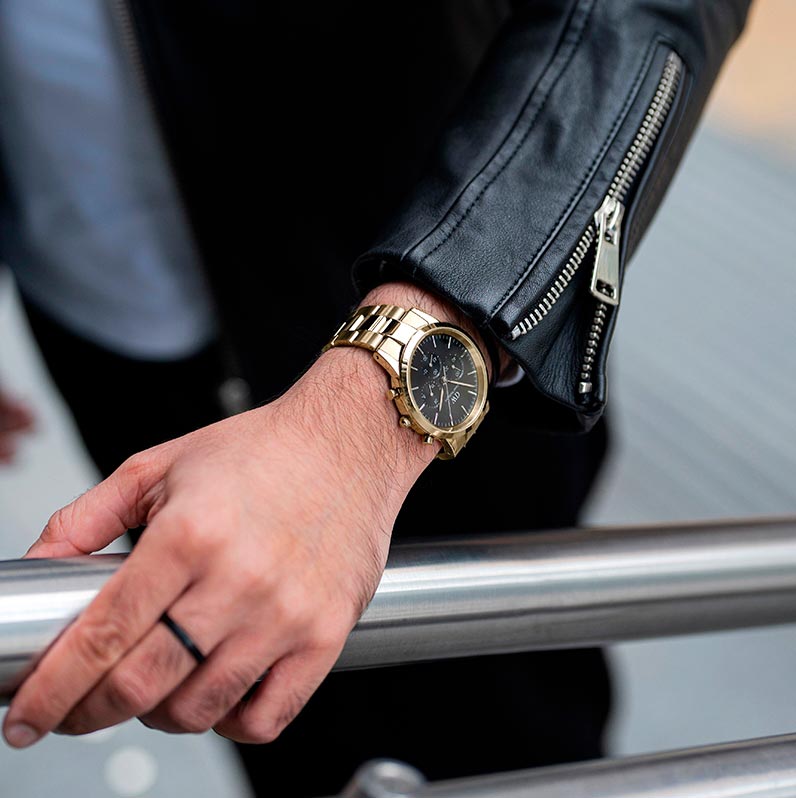 Наручные мужские часы-хронограф с секундомером Iconic Chronograph Link Onyx. Круглый стальной полированный корпус. Циферблат выполнен по технологии Sunray (солнечные лучи). Накладные метки в виде штрихов. Рифленая заводная головка. Индивидуальный серийный номер. Стальной браслет с раскладывающейся застежкой.