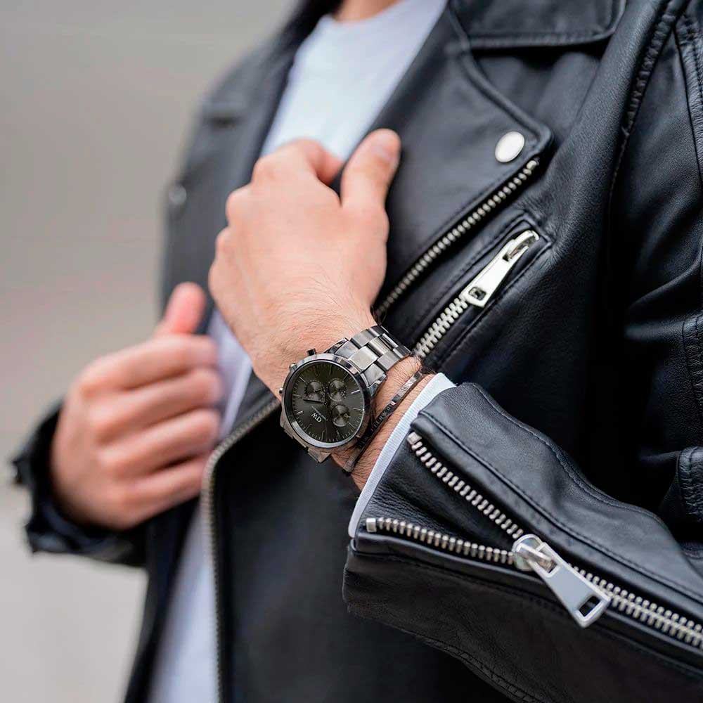 Наручные мужские часы-хронограф с секундомером Iconic Chronograph Link Graphite GM. Круглый стальной полированный корпус. Циферблат выполнен по технологии Sunray (солнечные лучи). Накладные метки в виде штрихов. Рифленая заводная головка. Индивидуальный серийный номер. Стальной браслет с раскладывающейся застежкой.