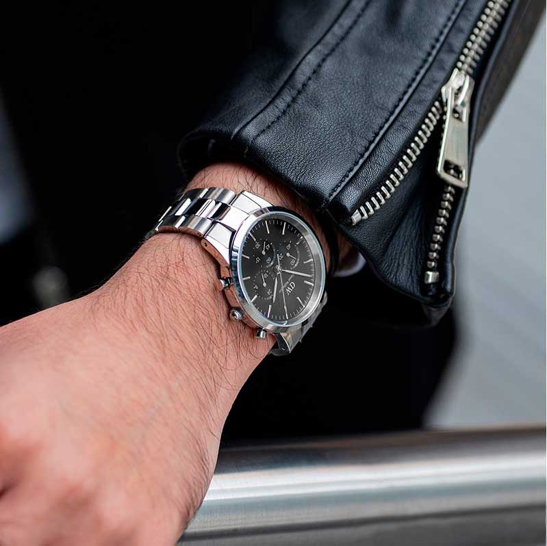 Наручные мужские часы-хронограф с секундомером Iconic Chronograph Link Onyx S. Круглый стальной полированный корпус. Циферблат выполнен по технологии Sunray (солнечные лучи). Накладные метки в виде штрихов. Рифленая заводная головка. Индивидуальный серийный номер. Стальной браслет с раскладывающейся застежкой.