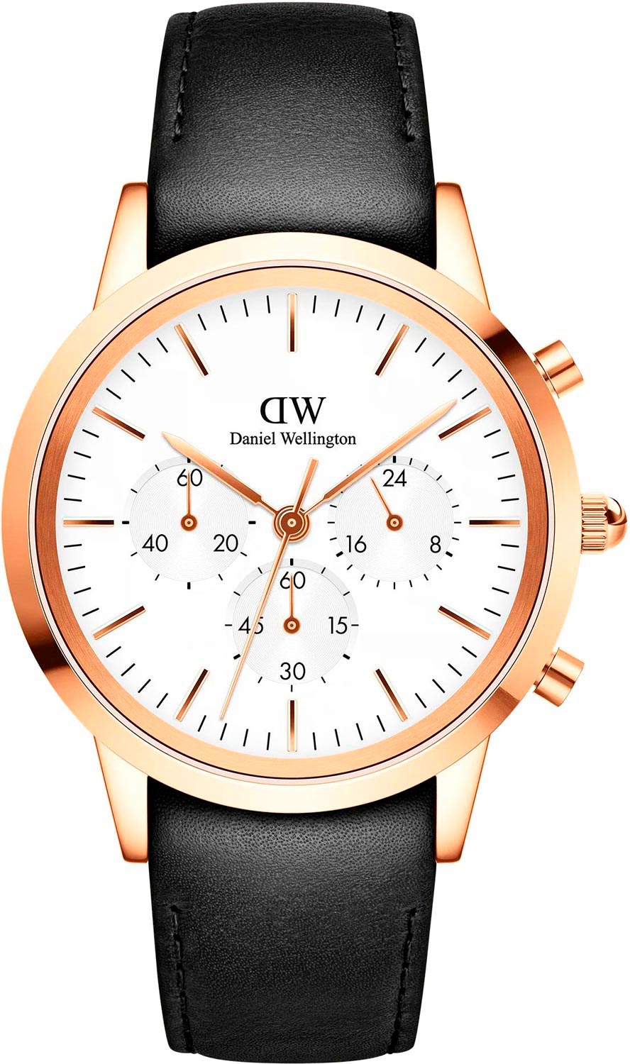 Наручные мужские часы-хронограф с секундомером Iconic Chronograph Sheffield RG. Круглый стальной полированный корпус. Матовый циферблат украшен фирменным логотипом Daniel Wellington. Накладные метки в виде штрихов. Рифленая заводная головка. Индивидуальный серийный номер. Удобный кожаный ремешок с классической застежкой.