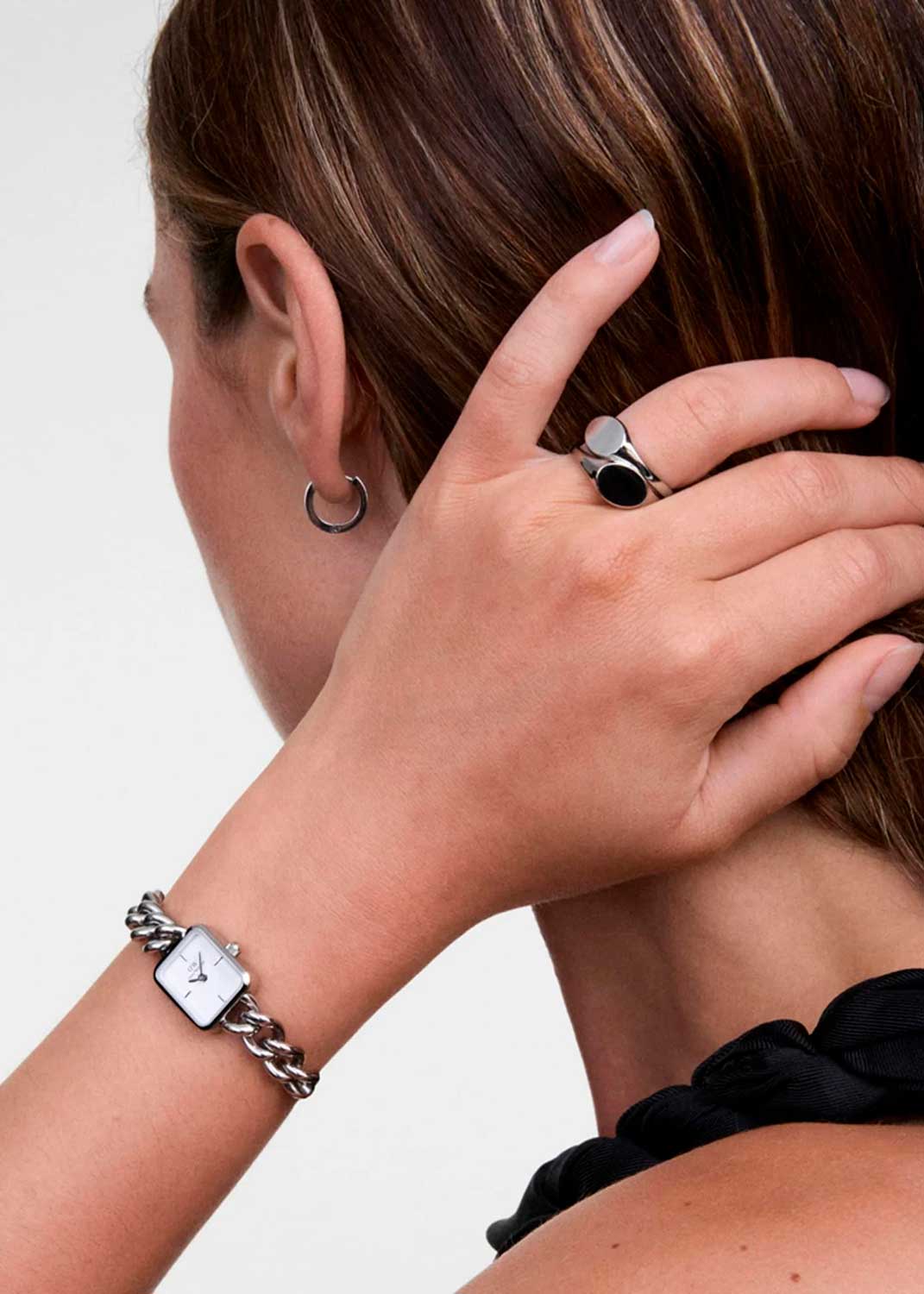 Наручные женские часы-цепочка Jolie Chain Silver. Миниатюрный стальной прямоугольный корпус с полированной отделкой. Надежный японский кварцевый механизм. Двухуровневый циферблат с фирменным логотипом Daniel Wellington. Накладные метки в виде штрихов. Секундная стрелка отсутсвует. Рифленая заводная головка. Массивная стальная цепочка с регулируемыми съемными звеньями.