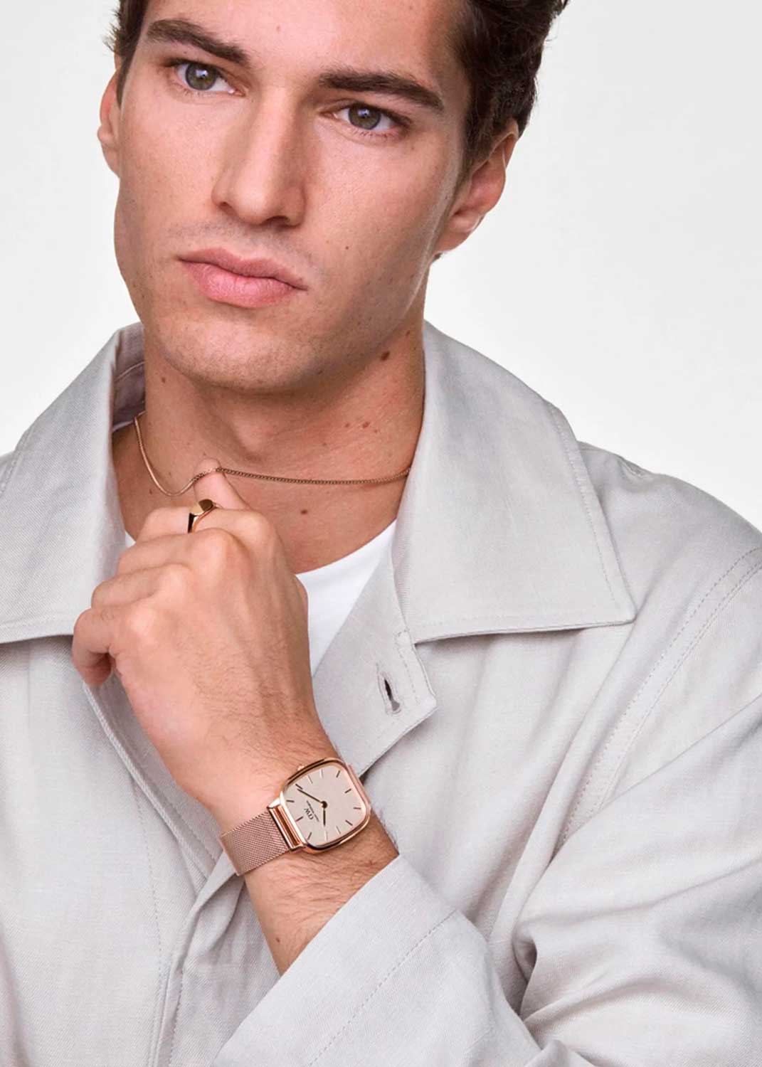 Винтажные наручные мужские часы Marlon Wire Linen Rose Gold. Стальной прямоугольный корпус в форме подушки. Японский кварцевый механизм. Циферблат с тиснением в виде льняного полотна, дополнен фирменным логотипом Daniel Wellington. Накладные метки в виде штрихов. Секундная стрелка отсутсвует. Рифленая заводная головка. Надежный и удобный стальной браслет с регулируемой застежкой.