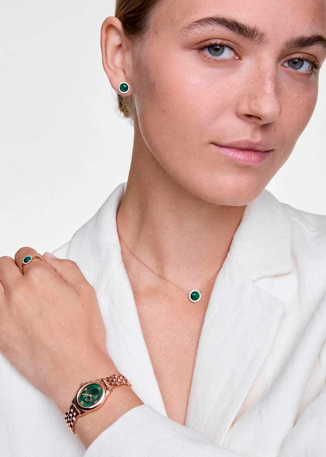 Наручные женские ультратонкие часы Ophelia Mini Emerald Rose Gold. Овальный полированный стальной корпус. Японский кварцевый механизм. Двухуровневый циферблат с декоративной центральной частью, дополнен фирменным логотипом Daniel Wellington. Накладные метки в виде римских цифр. Секундная стрелка отсутсвует. Рифленая заводная головка. Стальной полированный браслет с раскладывающейся застежкой.