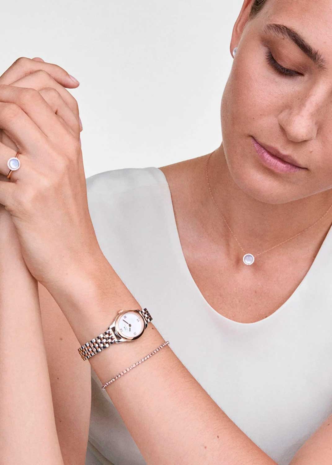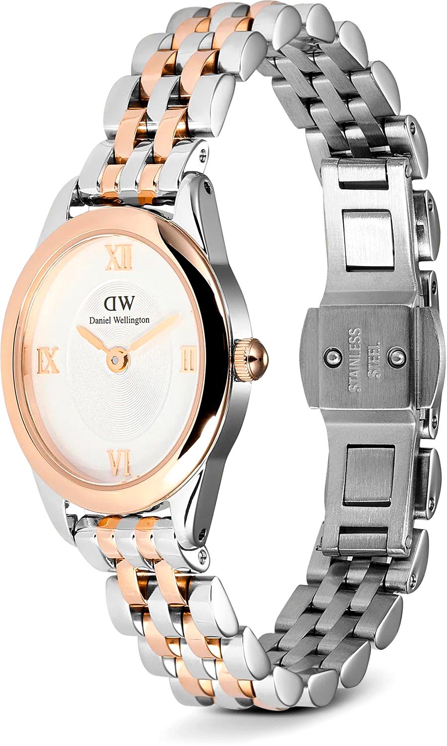 Наручные женские ультратонкие часы Ophelia Mini Two Tone Rose Gold. Овальный полированный стальной корпус. Японский кварцевый механизм. Двухуровневый циферблат с декоративной центральной частью, дополнен фирменным логотипом Daniel Wellington. Накладные метки в виде римских цифр. Секундная стрелка отсутсвует. Рифленая заводная головка. Стальной полированный браслет с раскладывающейся застежкой.