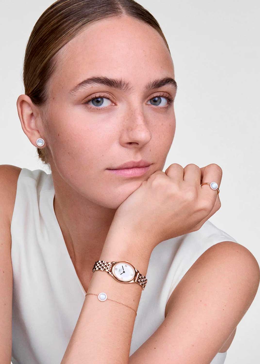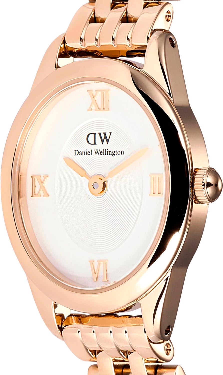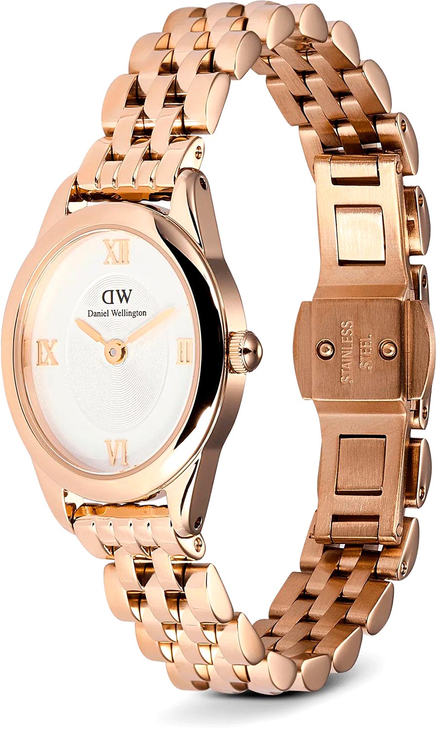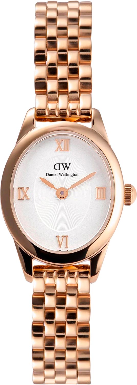 Наручные женские ультратонкие часы Ophelia Mini Rose Gold. Овальный полированный стальной корпус. Японский кварцевый механизм. Двухуровневый циферблат с декоративной центральной частью, дополнен фирменным логотипом Daniel Wellington. Накладные метки в виде римских цифр. Секундная стрелка отсутсвует. Рифленая заводная головка. Стальной полированный браслет с раскладывающейся застежкой.
