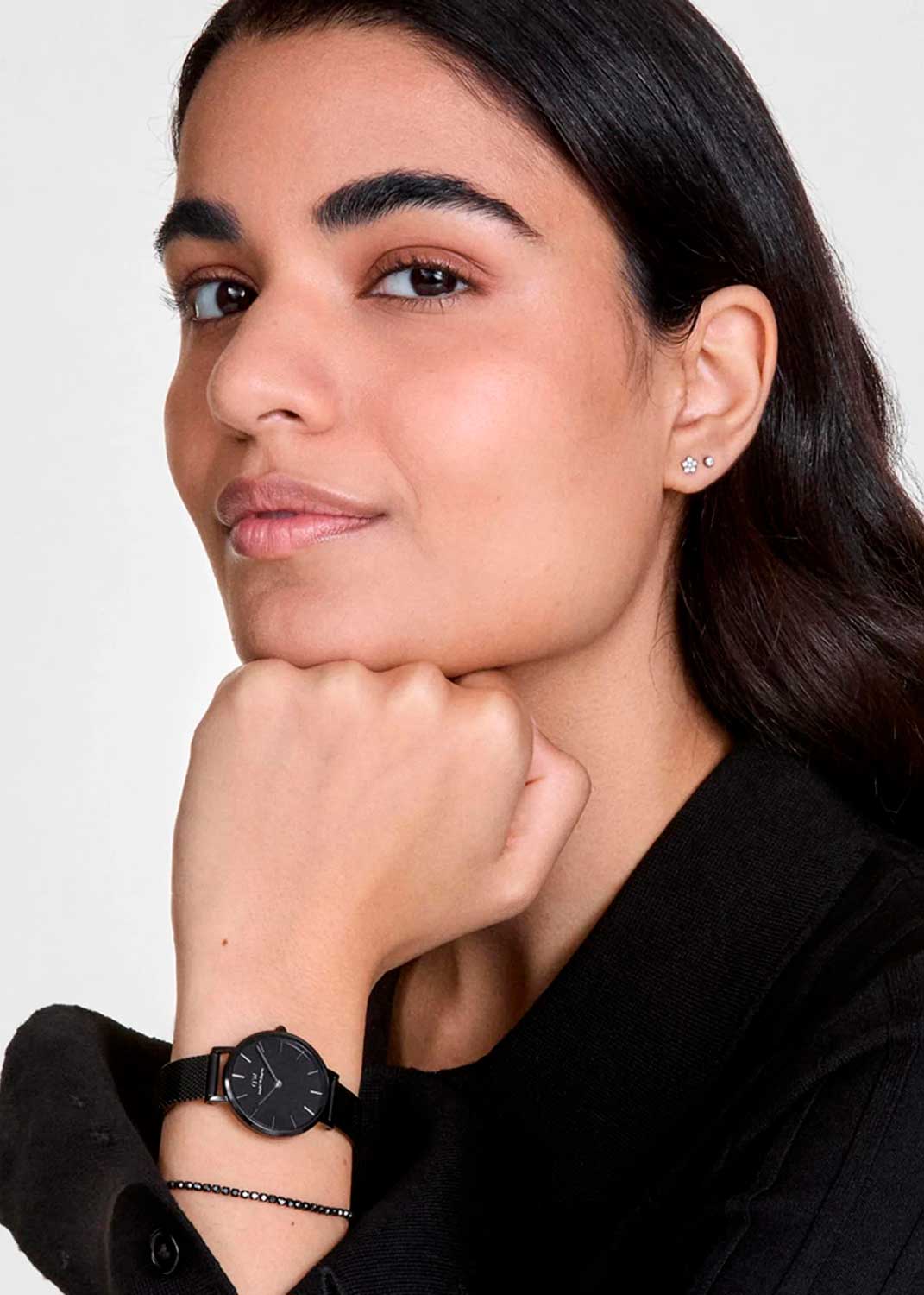 Ультратонкие женские часы Petite Reflection Black в стальном круглом полированном корпусе. Японский кварцевый механизм. Зеркальный циферблат украшен фирменным логотипом Daniel Wellington. Накладные метки в виде штрихов. Секундная стрелка отсутсвует. Рифленая заводная головка. Отполированный надежный браслет миланского плетения с регулируемой застежкой.