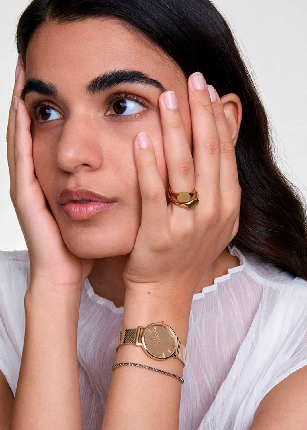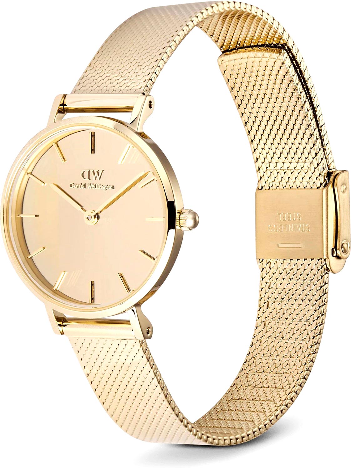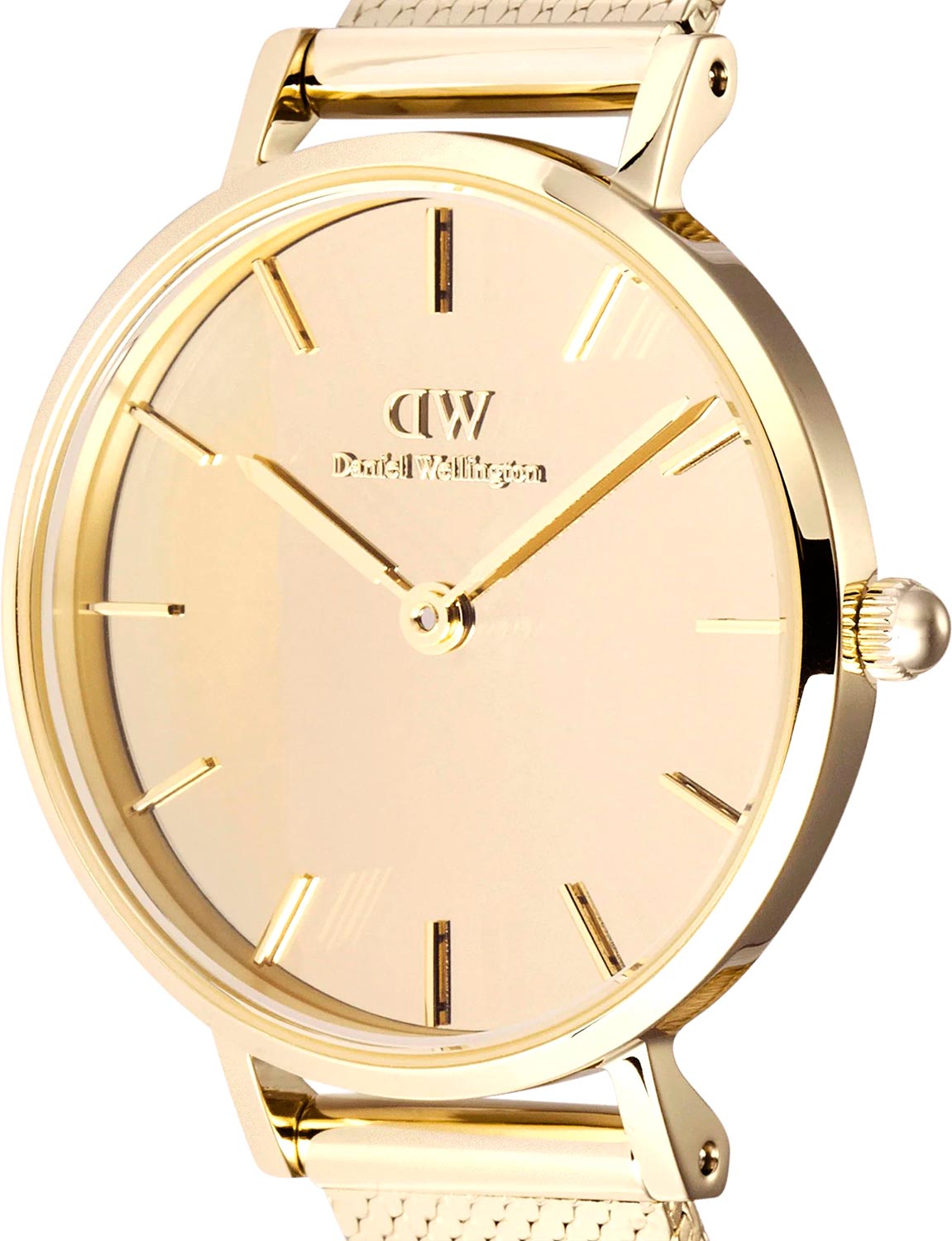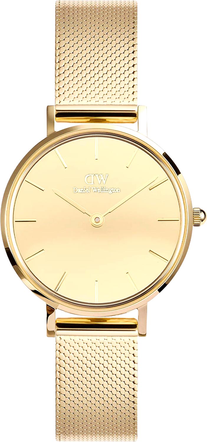 Ультратонкие женские часы Petite Reflection Gold в стальном круглом полированном корпусе. Японский кварцевый механизм. Зеркальный циферблат украшен фирменным логотипом Daniel Wellington. Накладные метки в виде штрихов. Секундная стрелка отсутсвует. Рифленая заводная головка. Отполированный надежный браслет миланского плетения с регулируемой застежкой.