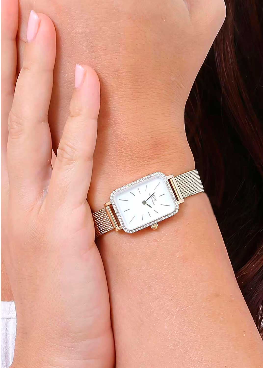 Наручные женские часы Quadro Lumine Bezel Evergold MOP. Стальной прямоугольный корпус с полированной отделкой. Безель украшен кристаллами. Надежный японский кварцевый механизм. Перламутровый циферблат украшен фирменным логотипом Daniel Wellington. Накладные метки в виде штрихов. Секундная стрелка отсутсвует. Рифленая заводная головка. Надежный и удобный браслет миланского плетения с регулируемой застежкой.