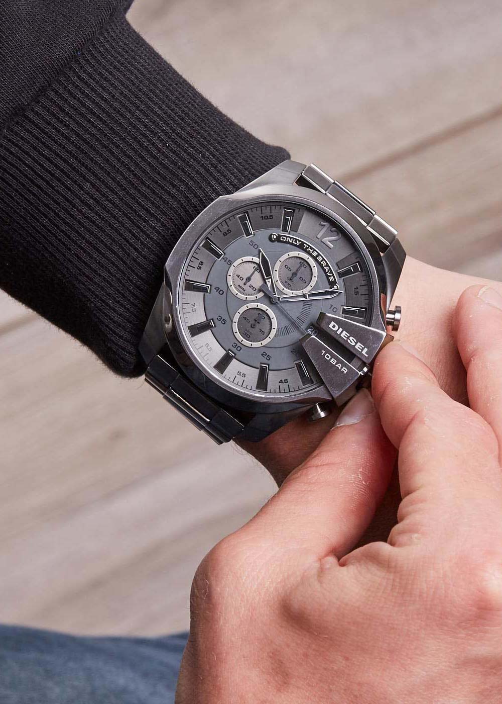 Стильный и функциональный аксессуар, который сможет многое рассказать о своем владельце. Mega Chief Chronograph. Часы-хронограф с секундомером. Круглый стальной корпус. Метки в виде штрихов и арабской цифры 12. Окошко даты находится в положении 3 часа. Рифленая заводная головка с защитой. Завинчивающаяся задняя крышка. Браслет с раскладывающейся застежкой.