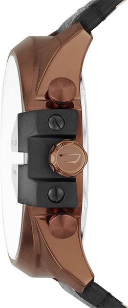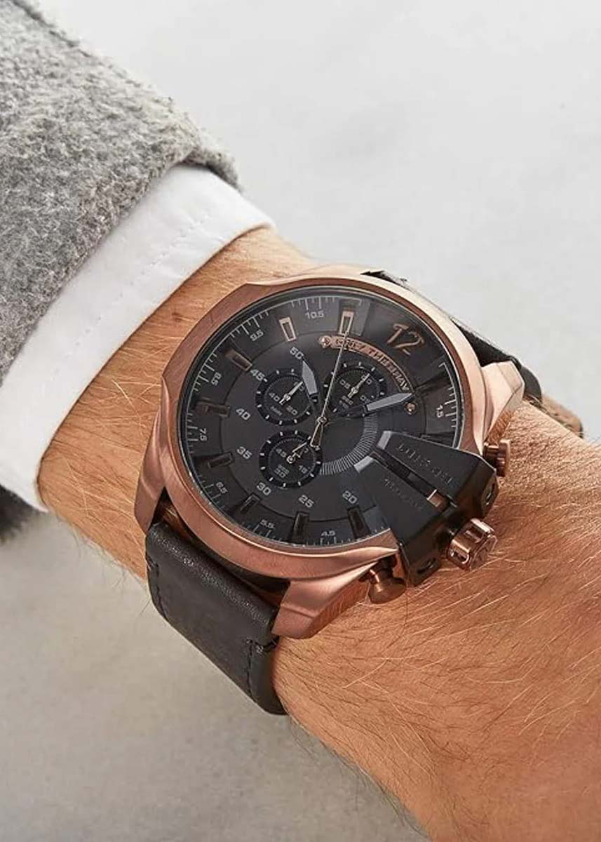 Mega Chief. Часы-хронограф с секундомером. Круглый стальной корпус. Метки в виде штрихов и арабской цифры 12. Окошко даты находится в положении 3 часа. Рифленая заводная головка с защитой. Завинчивающаяся задняя крышка. Кожаный ремешок с классической застежкой.