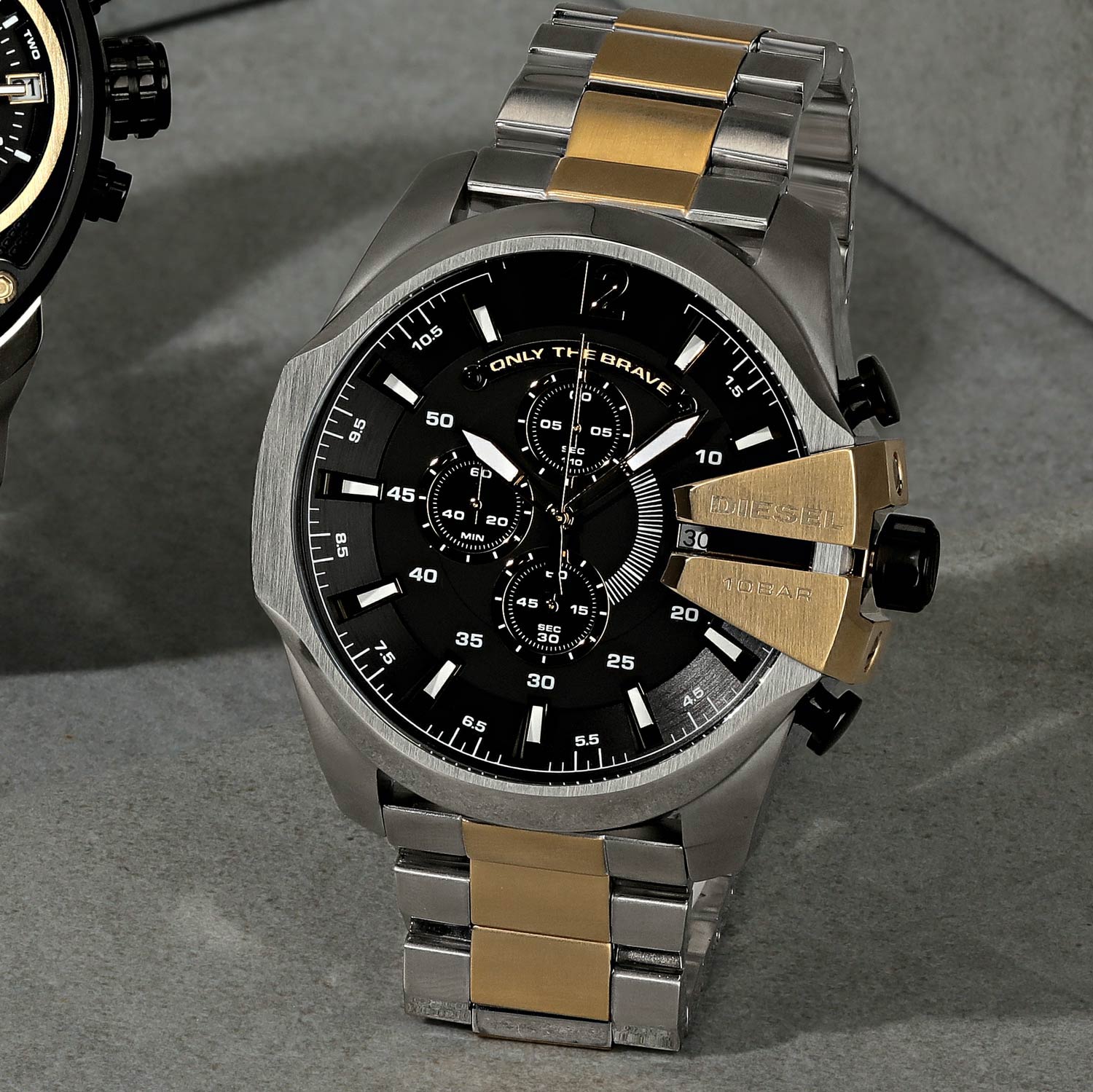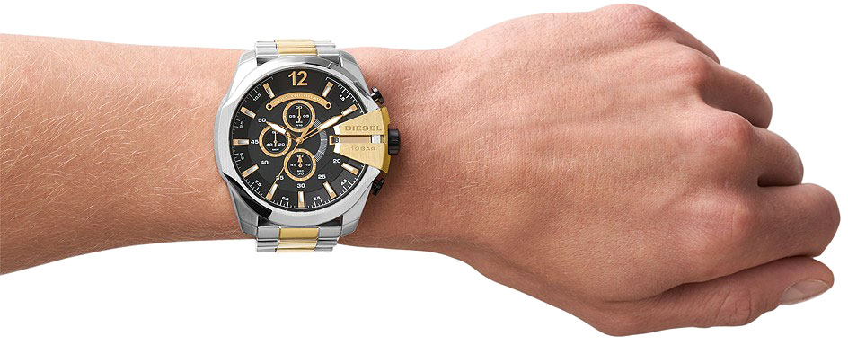 Многофункциональные часы с модным дизайном отлично подойдут для целеустремленного мужчины. Mega Chief. Часы-хронограф с секундомером. Массивный матовый водонепроницаемый корпус изготовлен из высококачественной нержавеющей стали. Циферблат украшен надписью Only The Brave. Мечевидные стрелки и метки в виде штрихов с люминесцентным покрытием, которое светится в темноте после непродолжительной зарядки на свету. Окошко даты находится в положении 3 часа. Завинчивающаяся задняя крышка. Надежный стальной браслет с раскладывающейся застежкой. Корпус, рифленая заводная головка и застежка украшены фирменными логотипами Diesel.
