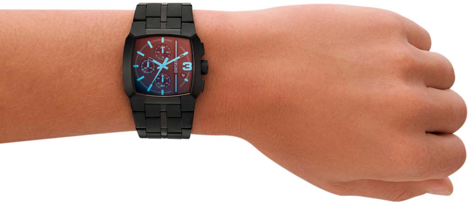 Идеальный аксессуар для активных людей, безудержных в своем стремлении действовать и двигаться вперед. Мужские часы-хронограф с секундомером. Массивный квадратный стальной корпус. Циферблат дополнен логотипом бренда. Метки в виде штрихов и арабской цифры 3. Окошко даты находится в положении 4 часа. Рифленая заводная головка с защитой. Стальной браслет с раскладывающейся застежкой.