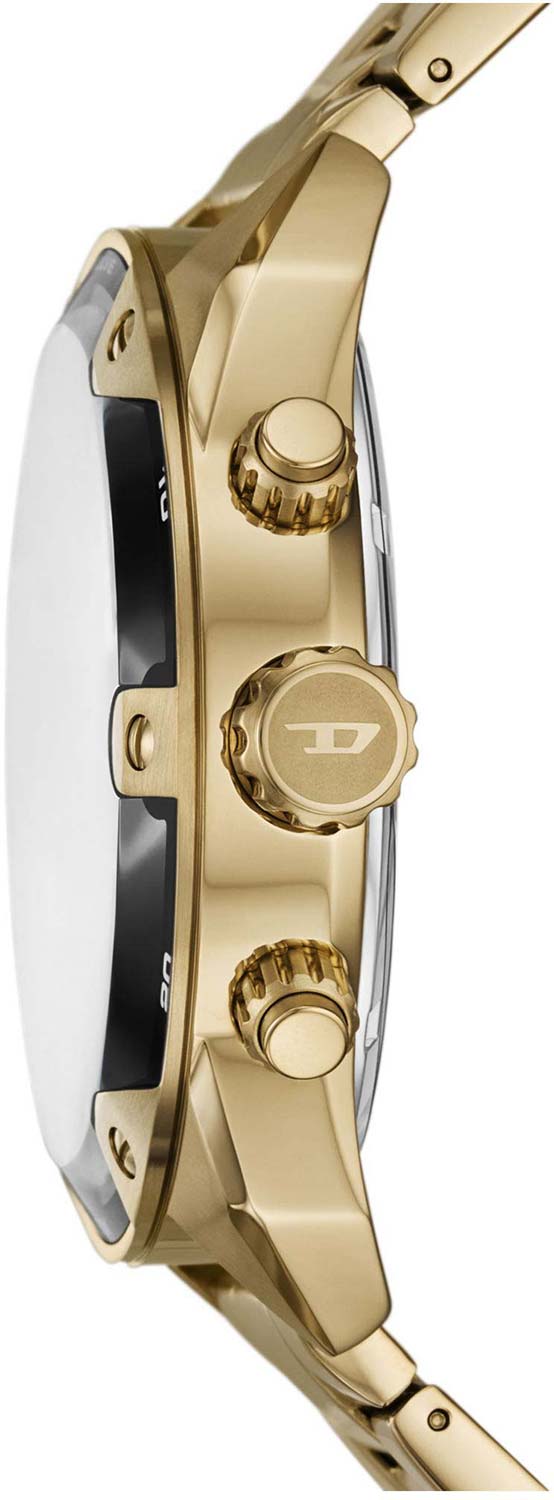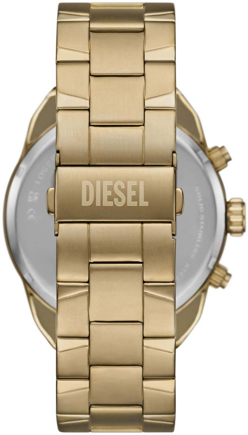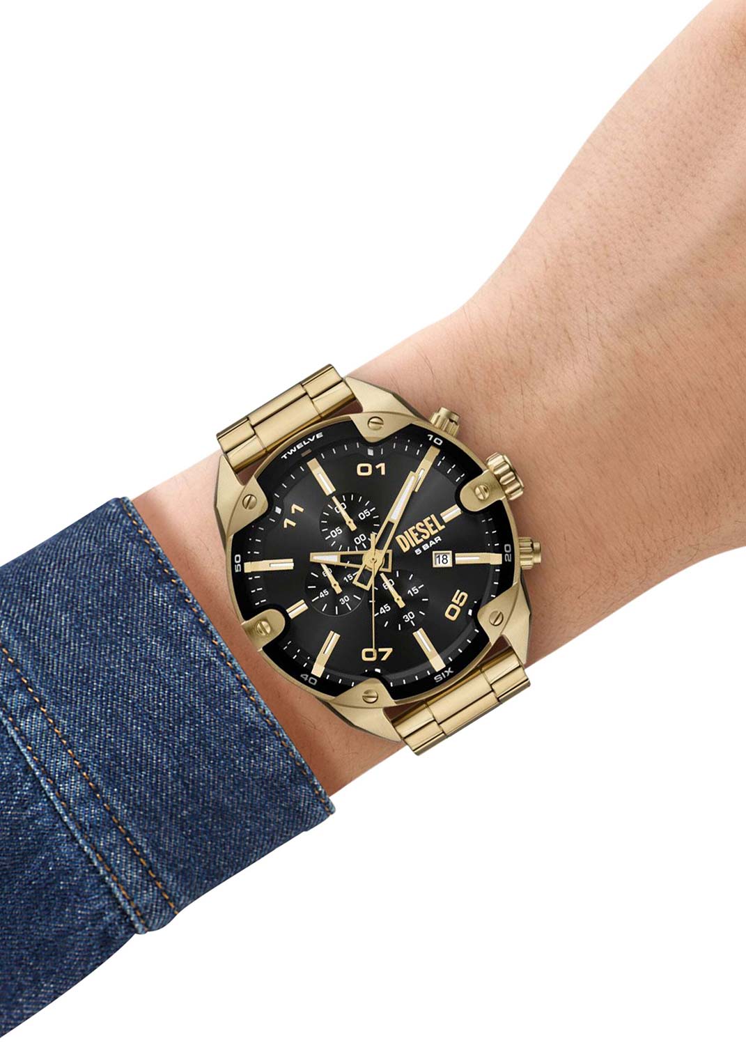 Spiked. Мужские часы с крупным корпусом из нержавеющей стали. Модель выделяется многотональным циферблатом в черном и золотом цветах с минеральным стеклом, окошком даты на отметке 4 часа, надписями six и twelve на отметках 6 и 12 соответственно. Часы оснащены хронографом. Браслет из нержавеющей стали с раскладывающейся застежкой с двойным нажатием.