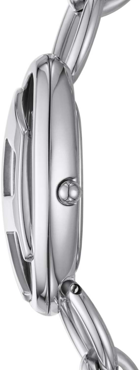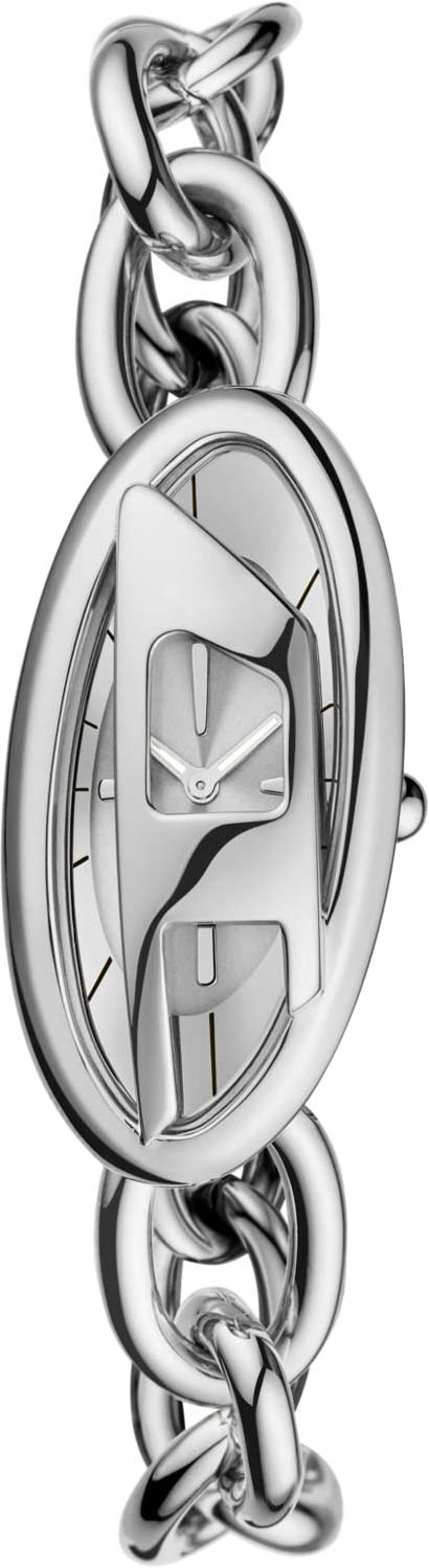 Женские наручные часы. Овальный стальной корпус с полированной поверхностью. Циферблат выполнен по технологии Sunray (солнечные лучи), декорирован перевернутой буквой D и защищен минеральным стеклом. Метки в виде штрихов. Гладкая заводная головка. Стальной браслет в виде цепочки. Застежка — тогл.
