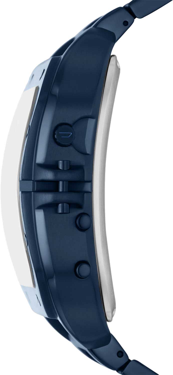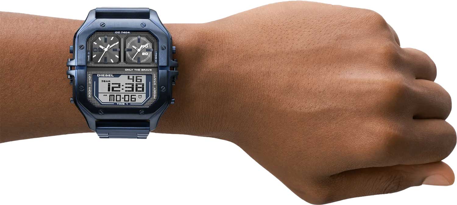 Clasher. Часы-хронограф с секундомером. 12-ти и 24-х часовой формат времени. Три механизма. Три часовых пояса. Массивный корпус изготовлен из нержавеющей стали. Безель украшен винтами. Аналоговые циферблаты с метками в виде штрихов выполнены по технологии Sunray (солнечные лучи).