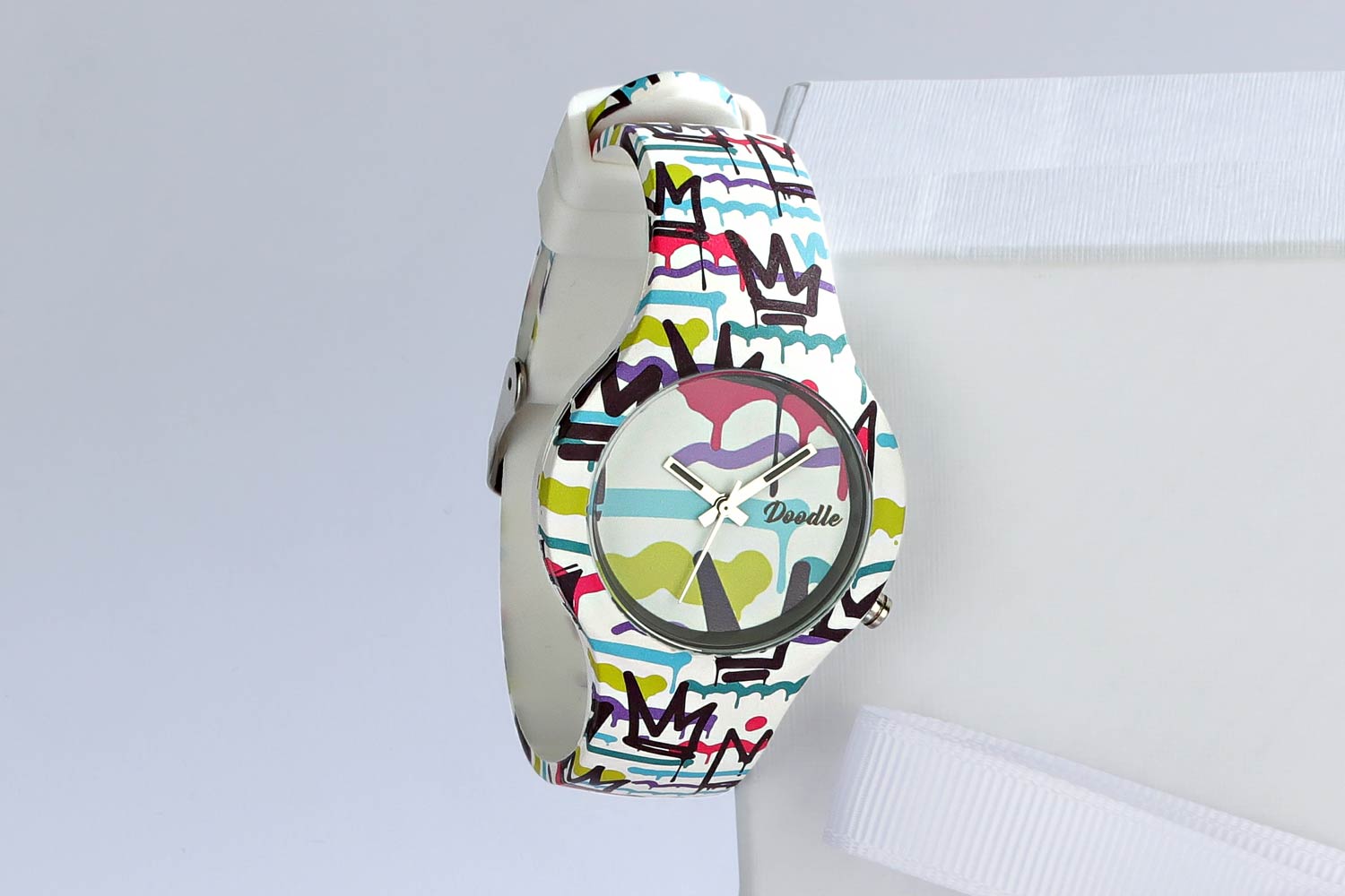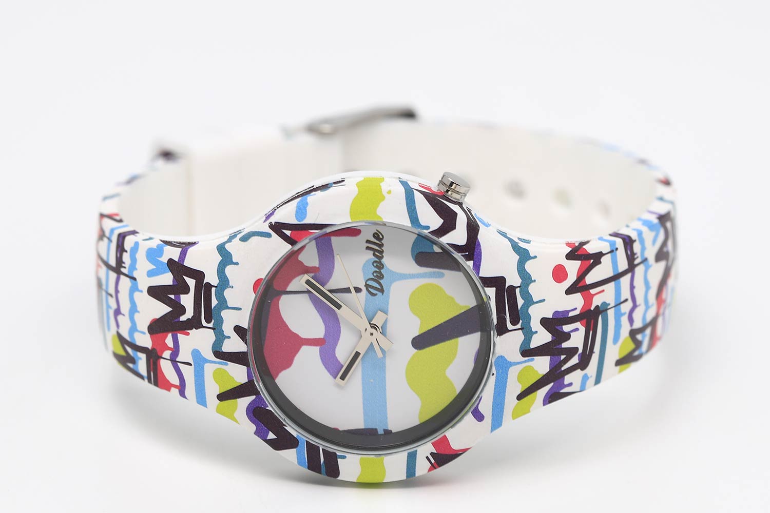 Смелые, яркие и стильные часы для художников и любителей граффити. Наручные женские часы Spray Paint из коллекции Graphics Mood. Круглый стальной корпус. Дизайн часов наполнен рисунками и граффити из аэрозольной краски. Ремешок из гипоаллергенного силикона с классической застежкой.