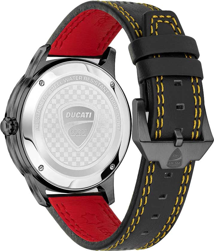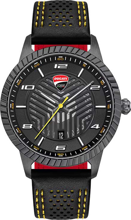 Спортивный дух этих часов от Ducati делает эту модель находкой для динамичных и практичных мужчин. Мужские часы. Круглый корпус из нержавеющей стали с рифленым безелем. Циферблат, задняя крышка и застежка украшены логотипом Ducati. Метки в виде штрихов и арабских цифр. Окошко даты находится в положении 6 часов. Рифленая заводная головка. Задняя крышка крепится на 4-х винтах. Перфорированный ремешок с желтой строчкой и классической застежкой.