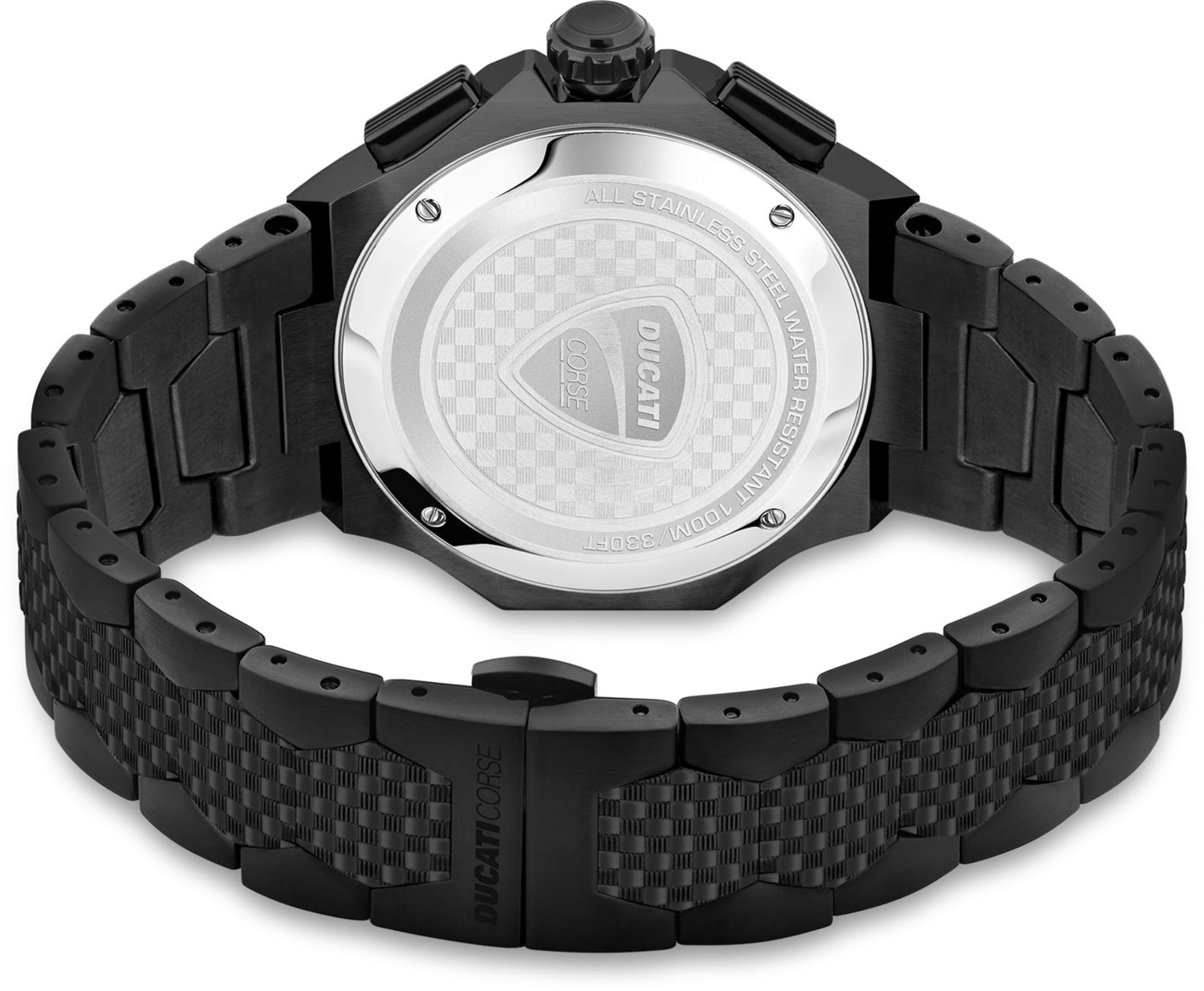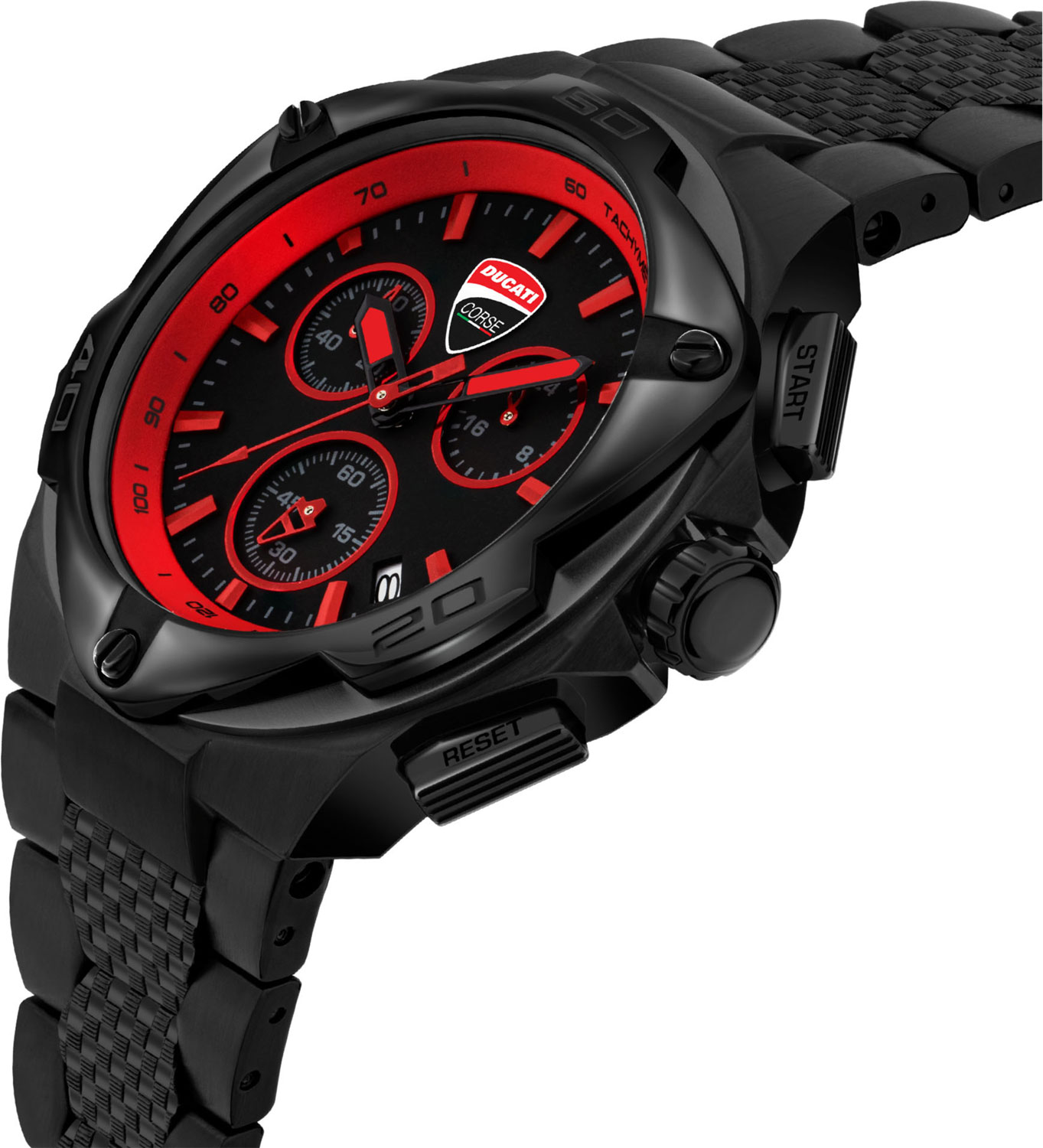 Стильный мужской хронограф в крупном стальном корпусе для тех, кто предпочитает динамичный и практичный образ жизни. Часы-хронограф с секундомером и тахиметром. 12-ти и 24-х часовой формат времени. Корпус из нержавеющей стали с закаленным минеральным стеклом Hardlex. Эффектный безель дополнен стильными винтами и метками в виде арабских цифр 20, 40 и 60. Циферблат и задняя крышка украшены фирменным логотипом Ducati. Часовые метки в виде штрихов. Окошко даты находится между 4 и 5 часов. Рифленые широкие кнопки и заводная головка с защитой. Задняя крышка крепится на 4-х винтах. Прочный браслет из нержавеющей стали с раскладывающейся застежкой и выгравированными центральными звеньями под углеродное волокно.