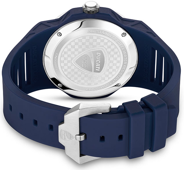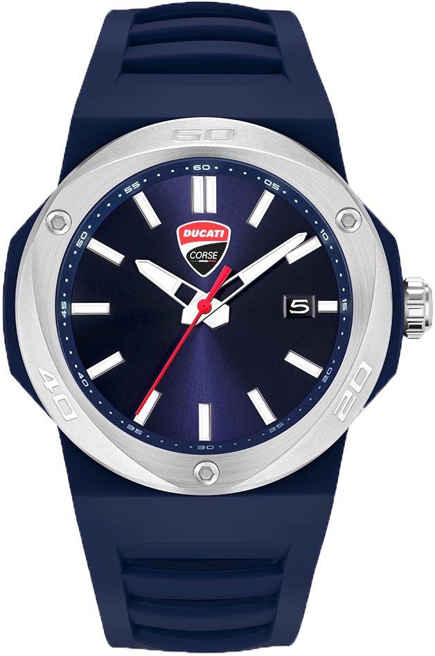 Выполненные в спортивном стиле часы будут идеальным аксессуаром, дополняющим ваш повседневный образ. Мужские часы. Циферблат с метками в виде штрихов украшен фирменным логотипом Ducati. Окошко даты находится в положении 3 часа. Рифленая заводная головка. Задняя крышка крепится на 4-х винтах. Удобный силиконовый ремешок с классической застежкой. На застежке и задней крышке выгравирован фирменный логотип Ducati.
