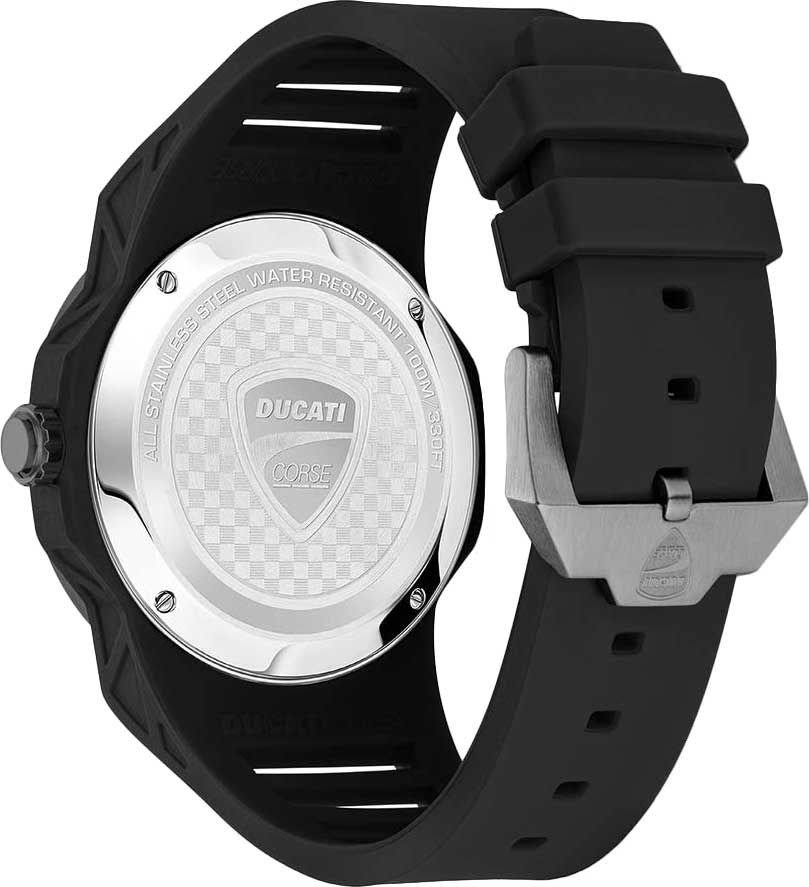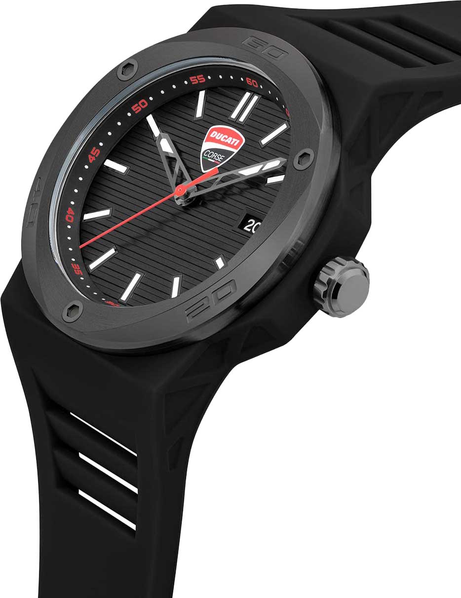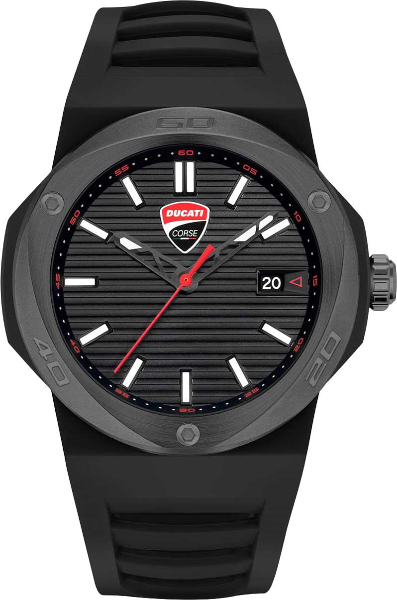 Выполненные в спортивном стиле часы будут идеальным аксессуаром, дополняющим ваш повседневный образ. Мужские часы. Циферблат с метками в виде штрихов украшен фирменным логотипом Ducati. Окошко даты находится в положении 3 часа. Рифленая заводная головка. Задняя крышка крепится на 4-х винтах. Удобный силиконовый ремешок с классической застежкой. На застежке и задней крышке выгравирован фирменный логотип Ducati.