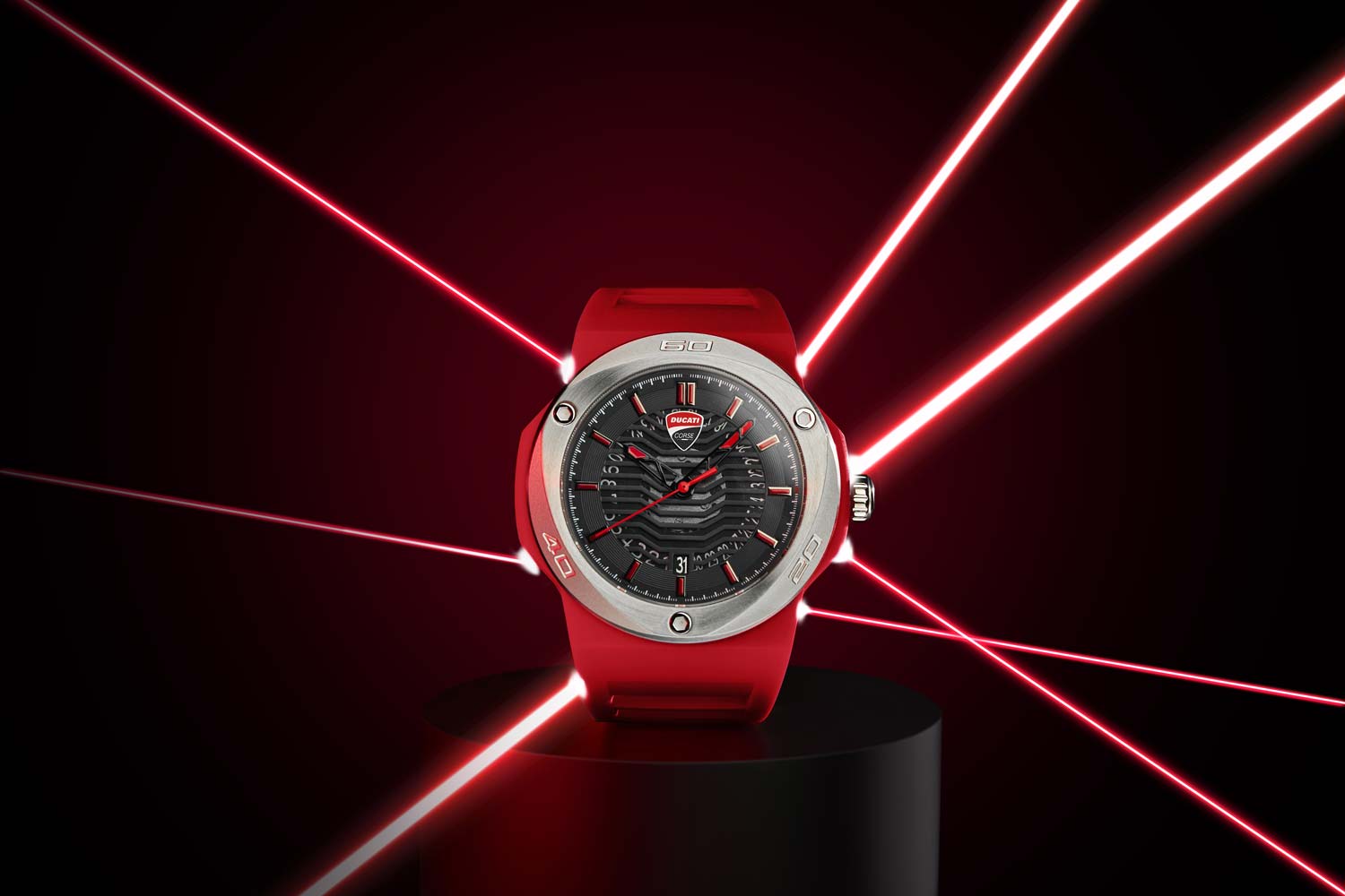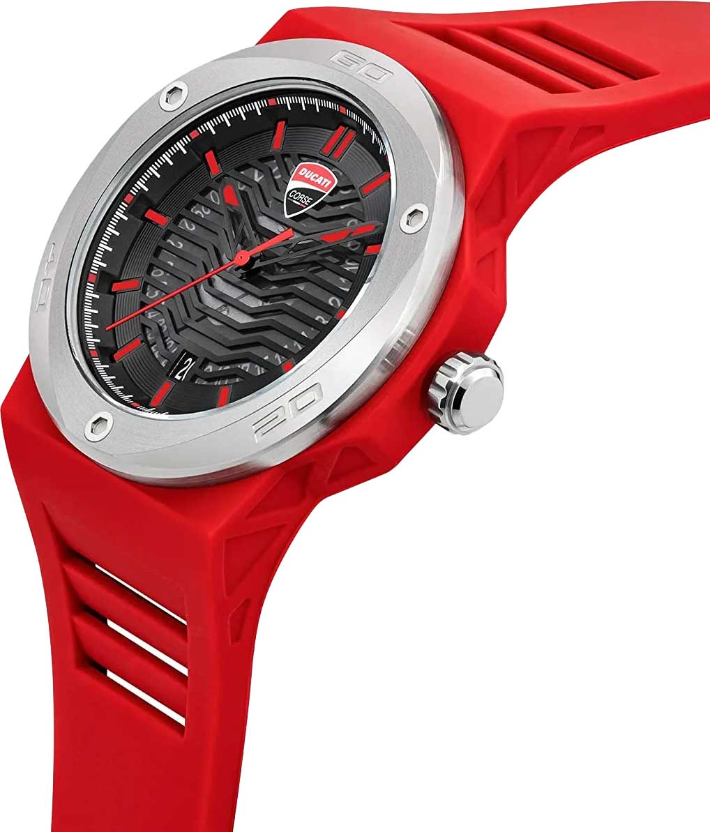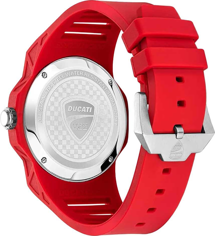 Выполненные в спортивном стиле часы будут идеальным аксессуаром, дополняющим ваш повседневный образ. Мужские часы. Циферблат с метками в виде штрихов украшен фирменным логотипом Ducati. Окошко даты находится в положении 6 часов. Рифленая заводная головка. Задняя крышка крепится на 4-х винтах. Удобный силиконовый ремешок с классической застежкой. На застежке и задней крышке выгравирован фирменный логотип Ducati.
