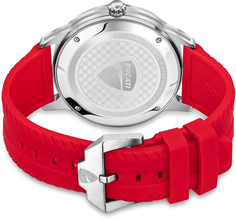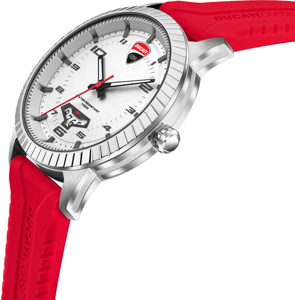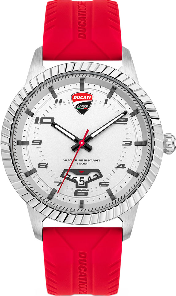Универсальный дизайн с широким циферблатом, спортивный стильный силиконовый ремешок и завораживающий безель делают эти часы готовыми к решению самых сложных повседневных задач на треке и вне его. Мужские часы. Круглый корпус из нержавеющей стали с рифленым безелем и закаленным минеральным стеклом Hardlex. Циферблат, задняя крышка и застежка украшены логотипом Ducati. Часовые метки в виде штрихов и арабских цифр. Окошко даты находится в положении 6 часов. Рифленая заводная головка. Задняя крышка крепится на винтах. Удобный силиконовый ремешок с классической застежкой.