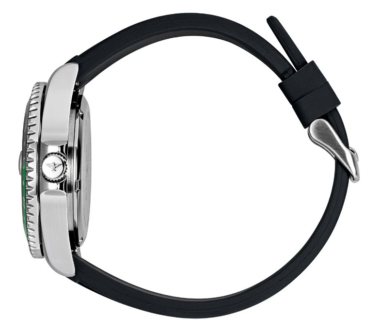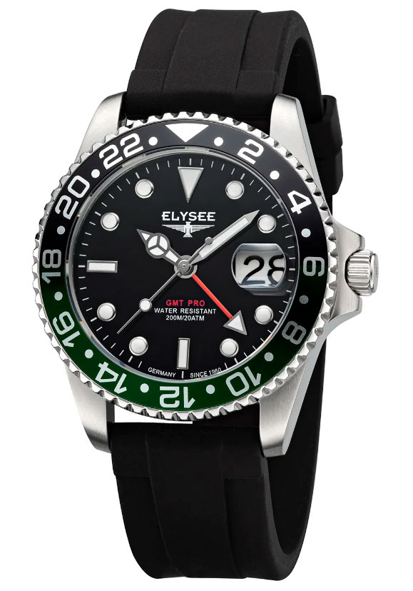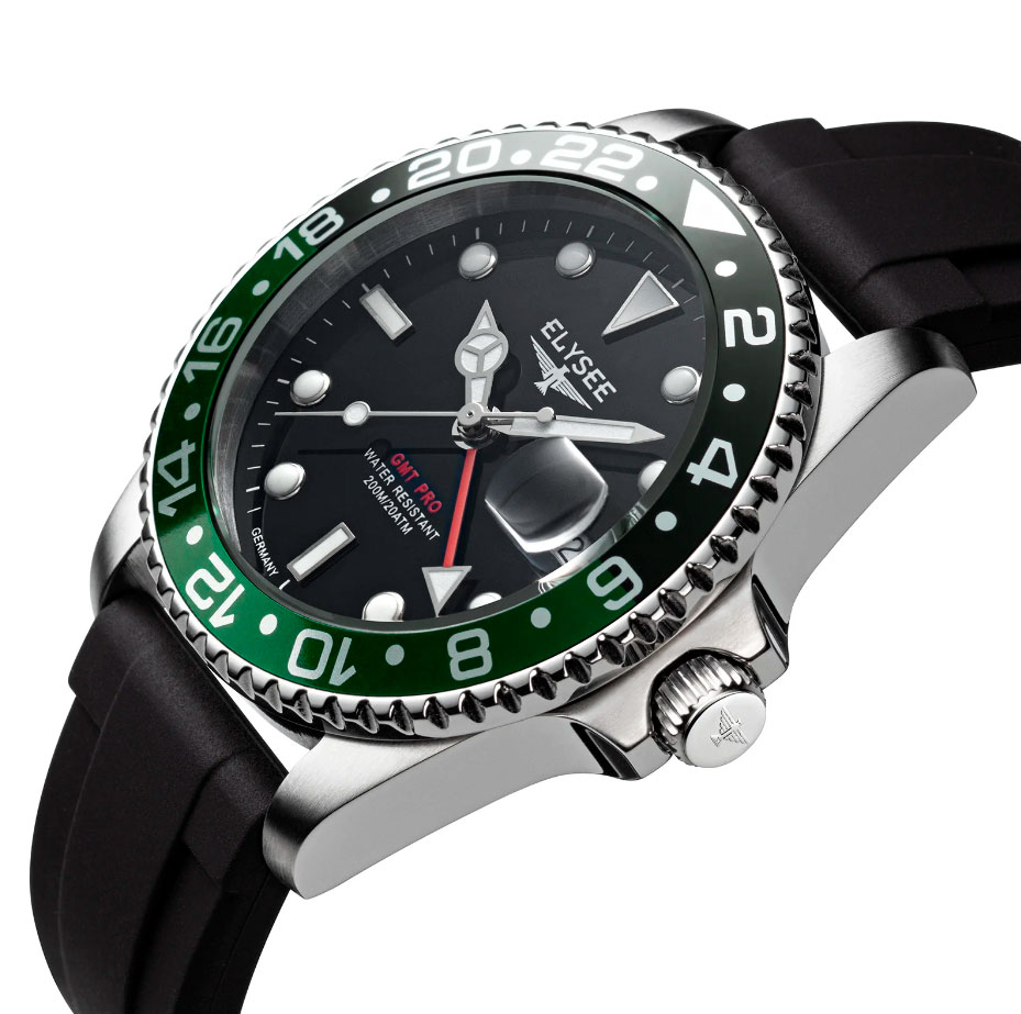 GMT Pro - это дайверские часы с сильным характером, которые используются, в частности, для занятий спортом благодаря своей высокой водонепроницаемости 20 ATM. GMT Pro. Мужские наручные часы. Круглый корпус из нержавеющей стали с рифленой заводной головкой. Метки и стрелки с люминесцентным покрытием, которое светится в темноте после непродолжительной зарядки на свету. Окошко даты с увеличительным стеклом находится в положении 3 часа. Второй часовой пояс отображается центральной стрелкой. Завинчивающаяся задняя крышка. Ремешок из высококачественного силикона с классической застежкой.