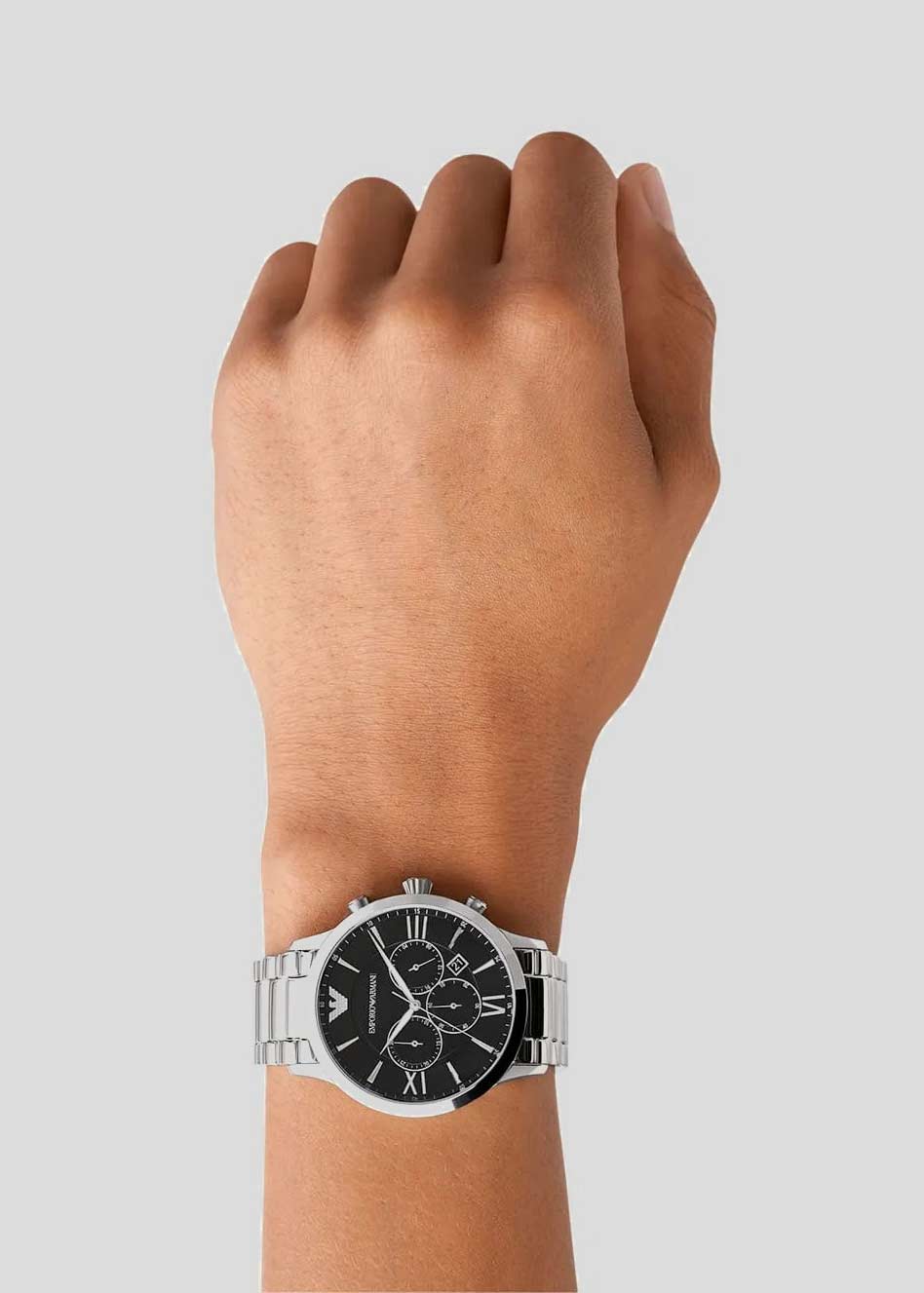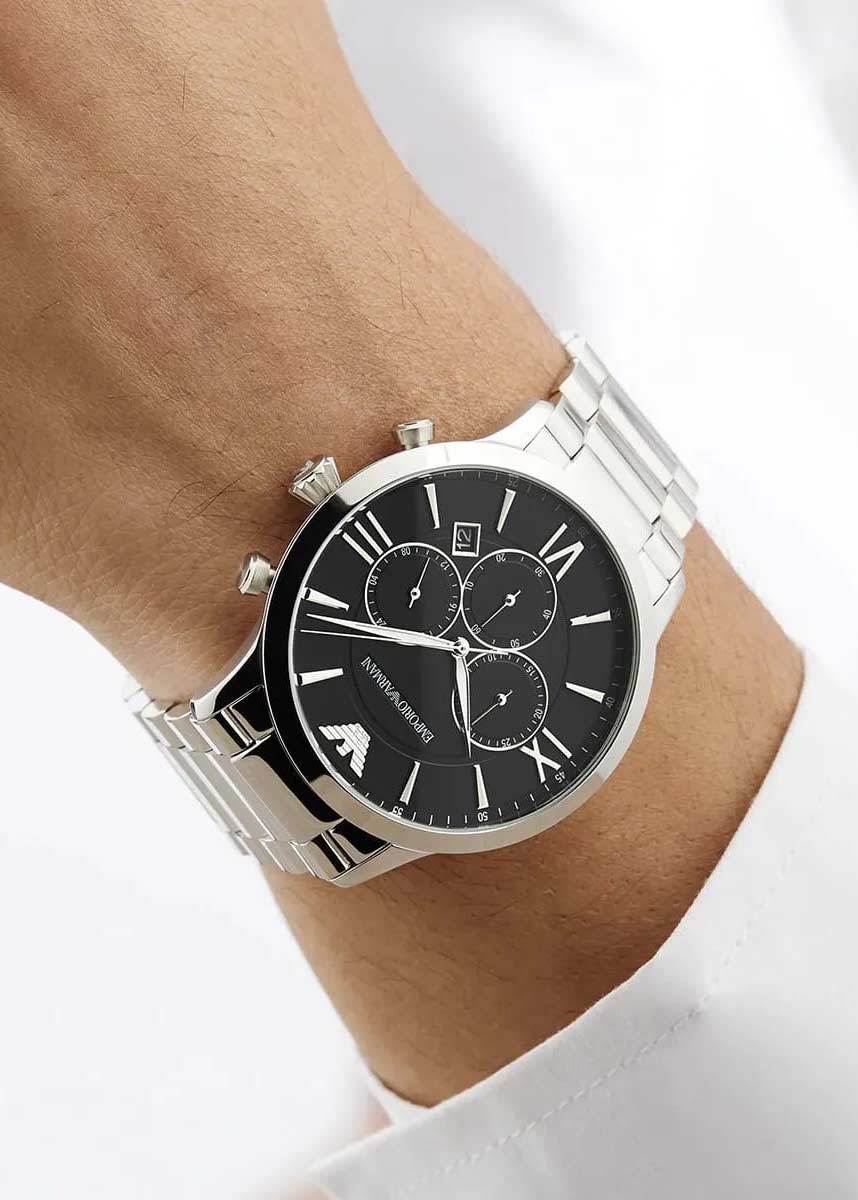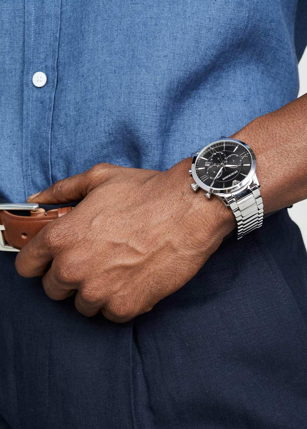 Мужские часы-хронограф с секундомером. 12-ти и 24-х часовой формат времени. Круглый стальной корпус. Циферблат выполнен по технологии Sunray (солнечные лучи) и защищен минеральным стеклом.