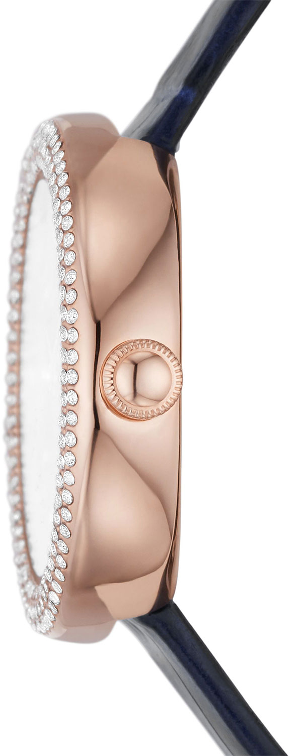 Привлекательный стиль этого женского аксессуара излучает уверенность и безупречность своей очаровательной владелицы. Rosa. Круглый корпус изготовлен из нержавеющей стали. Безель украшен паве из сияющих кристаллов. Циферблат украшен перламутром. Часовая и минутная стрелки в стиле Baton, секундная стрелка отсутствует. Метки в виде точек из кристаллов, 12-ти часовая метка в виде фирменного логотипа. Рифленая заводная головка. Задняя крышка крепится на винтах. Удобный текстурированный кожаный ремешок с классической застежкой.