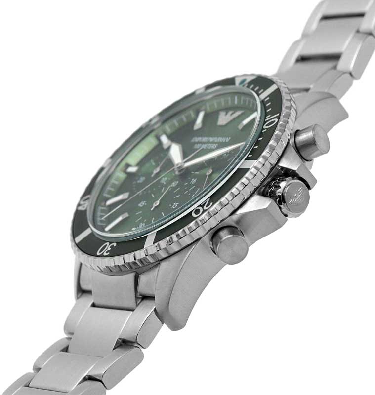 Часы-хронограф от Emporio Armani раскроют мужественный и спортивный характер своего обладателя. Diver. Часы-хронограф с секундомером. Циферблат выполнен по технологии Sunray (солнечные лучи). Метки в виде штрихов. Окошко даты находится между отметками 4 и 5 часов. Заводная головка с защитой. Браслет с раскладывающейся застежкой. Застежка с системой блокировки.