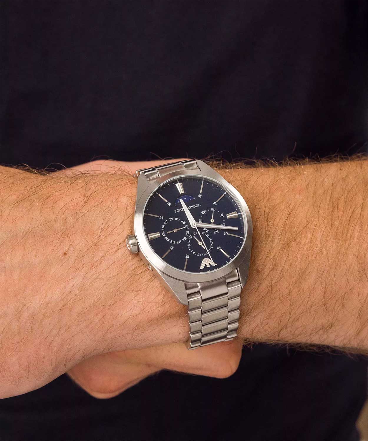 Мужские часы. Циферблат с метками в виде штрихов. Число, день недели и месяц вынесены на отдельные циферблаты. Индикатор фазы Луны. Браслет с раскладывающейся застежкой.
