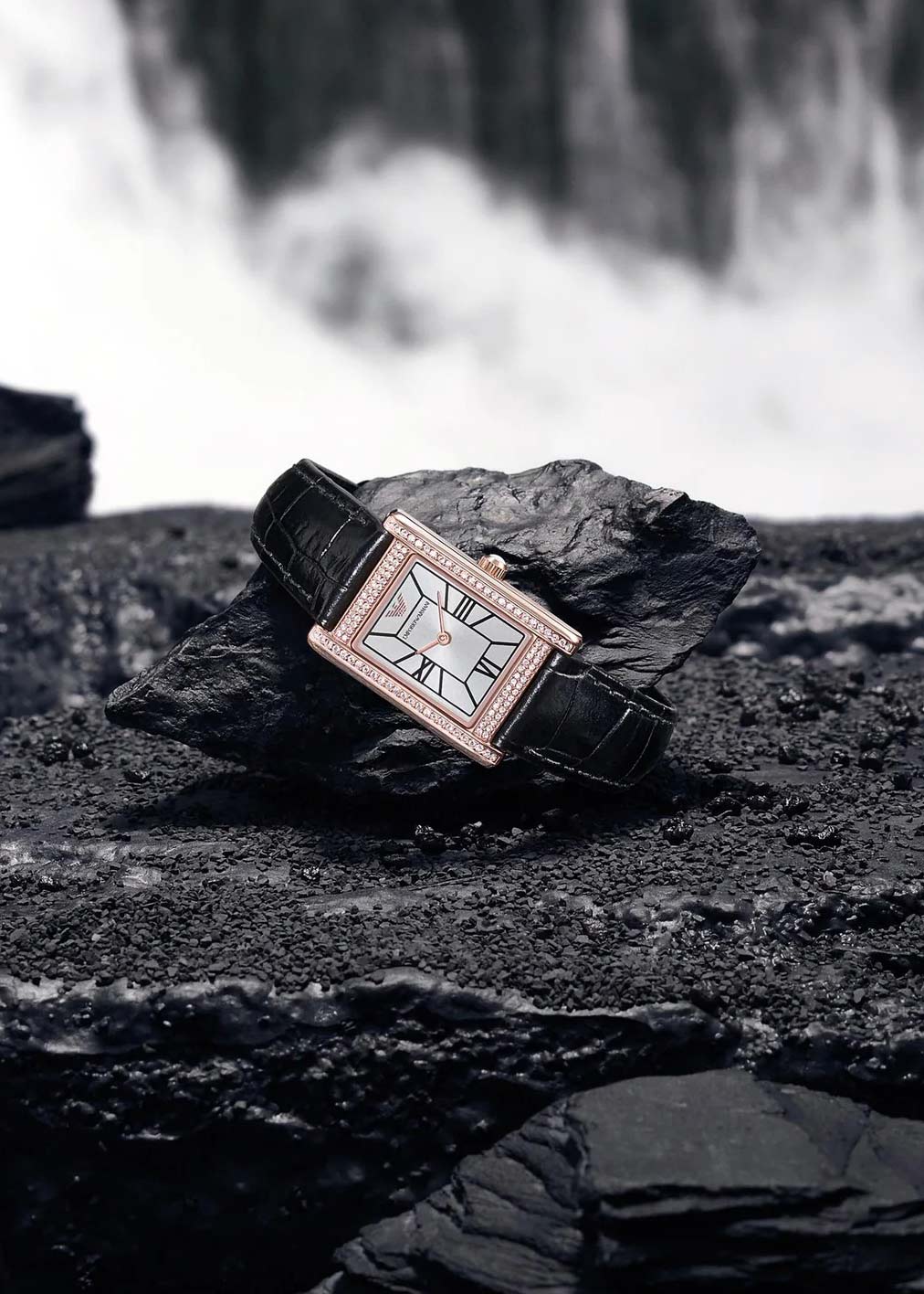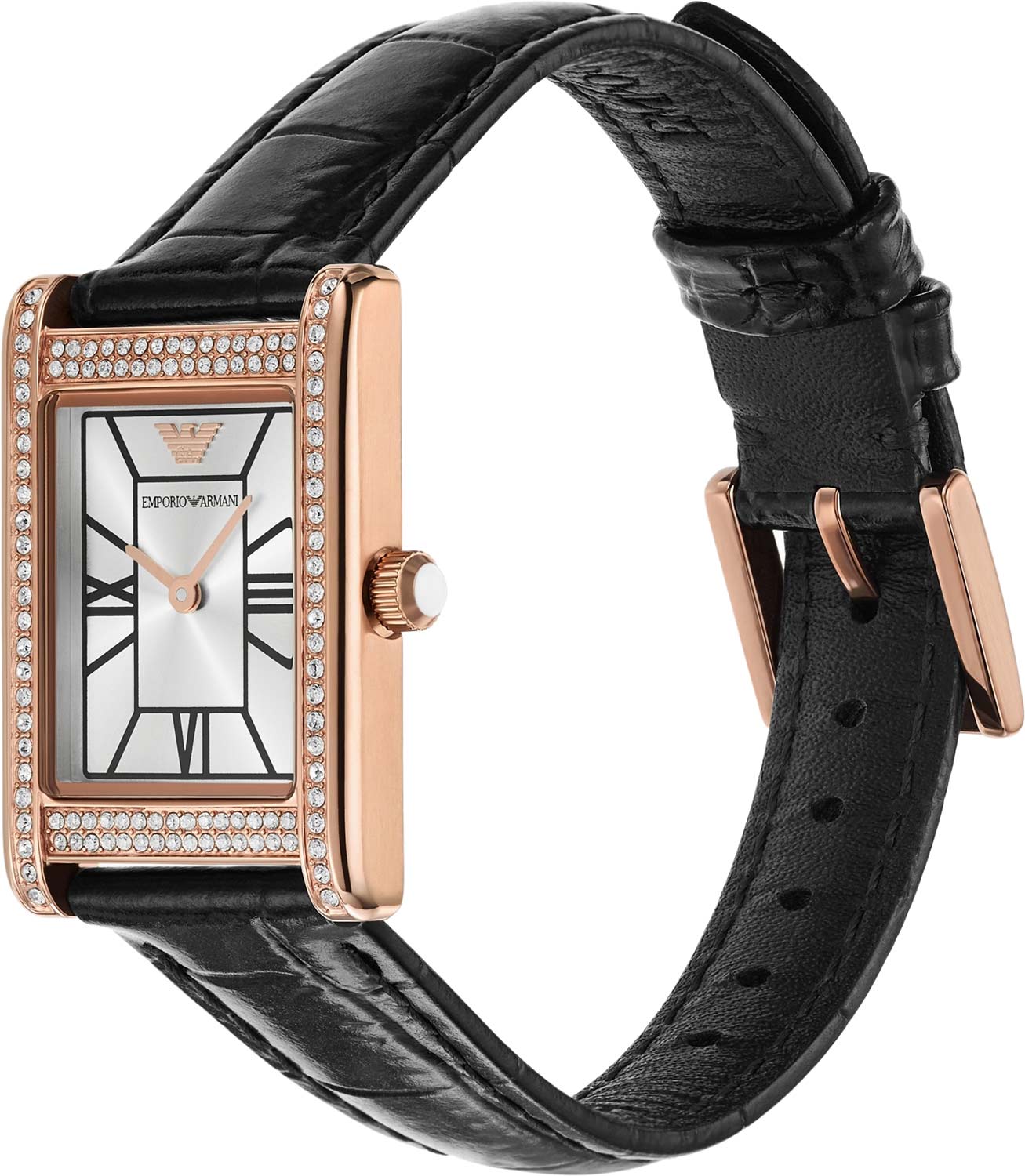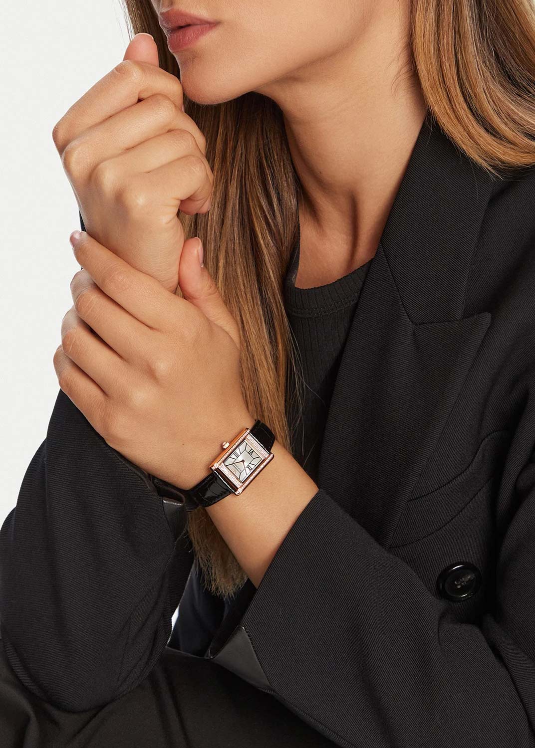 Женские наручные часы. Безель украшен кристальным паве. Прямоугольный стальной корпус. Циферблат выполнен по технологии Sunray (солнечные лучи). Метки в виде римских цифр и штрихов. Секундная стрелка отсутствует.