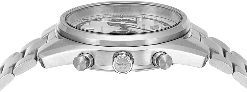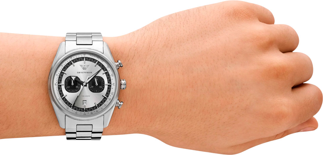 Мужские часы-хронограф Racer с секундомером и тахиметром. 12-ти и 24-х часовой формат времени. Циферблат с метками в виде штрихов выполнен по технологии Sunray (солнечные лучи). Окошко даты находится в положении 6 часов. Рифленая заводная головка. Стальной браслет с раскладывающейся застежкой.