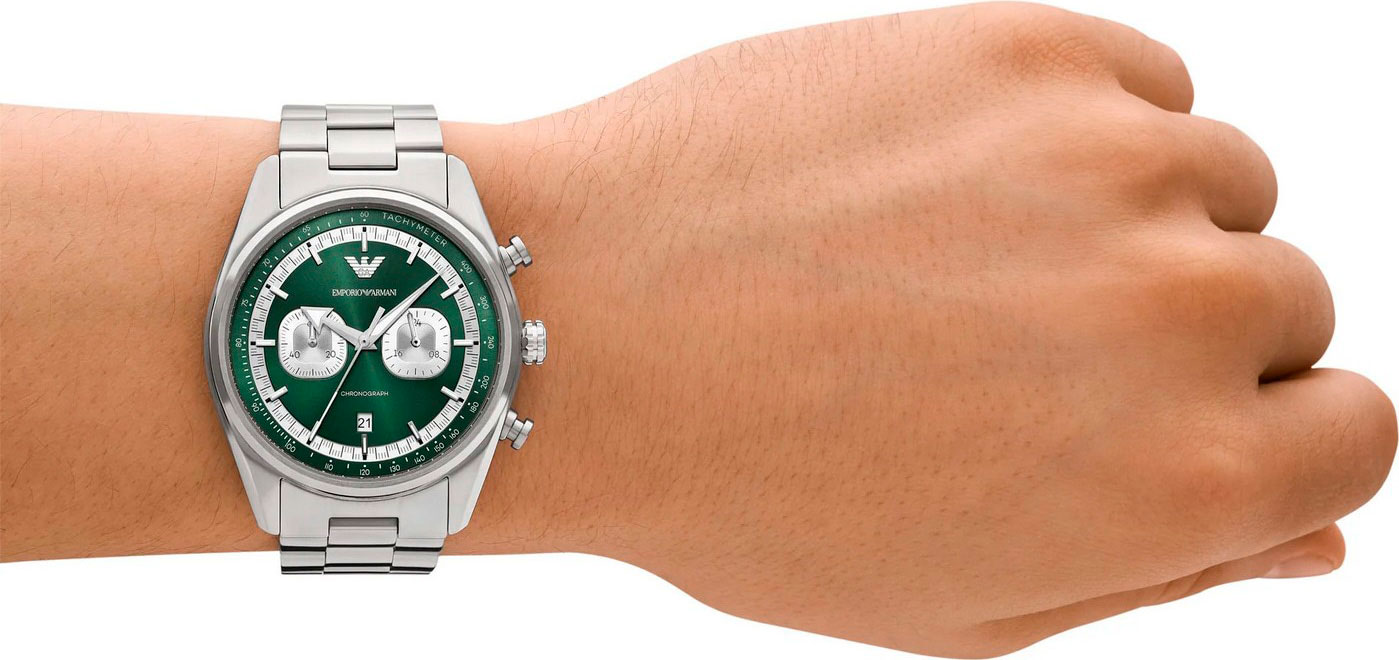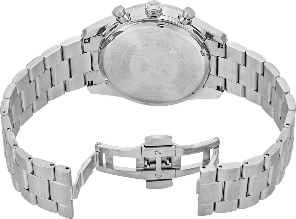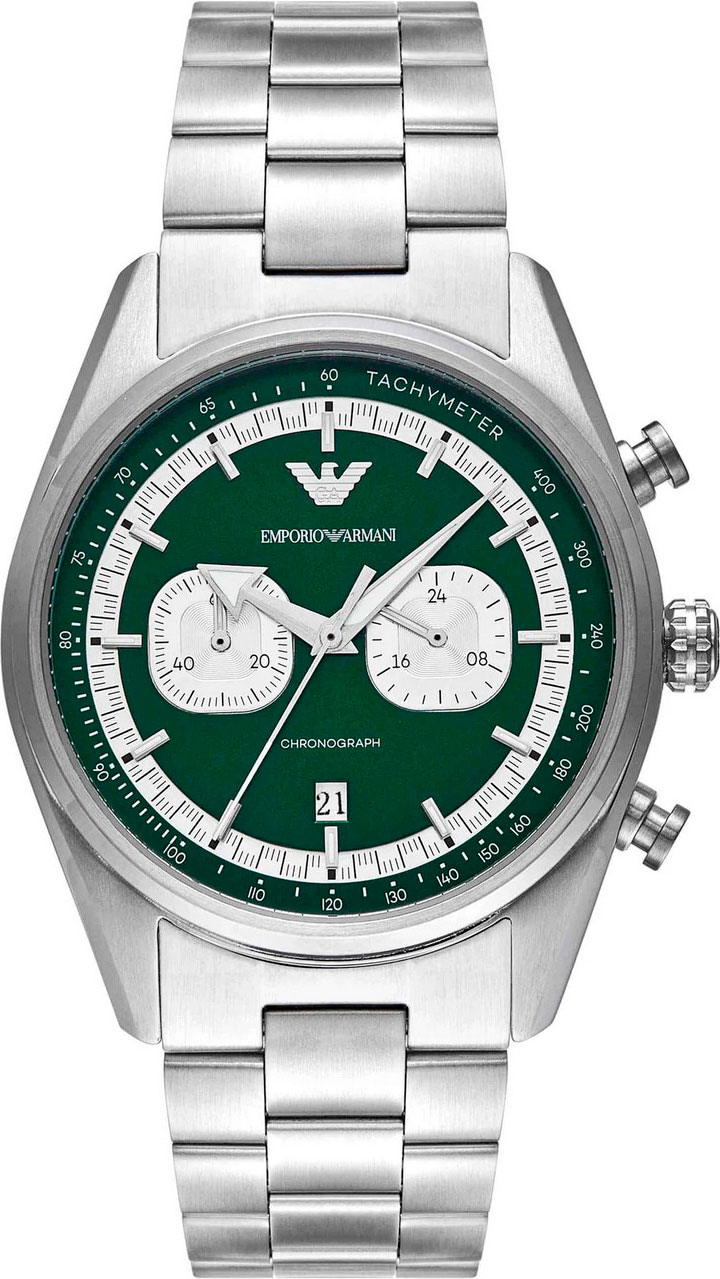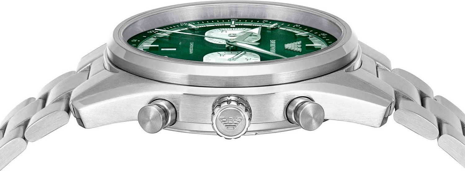Мужские часы-хронограф Racer с секундомером и тахиметром. 12-ти и 24-х часовой формат времени. Циферблат с метками в виде штрихов выполнен по технологии Sunray (солнечные лучи). Окошко даты находится в положении 6 часов. Рифленая заводная головка. Стальной браслет с раскладывающейся застежкой.