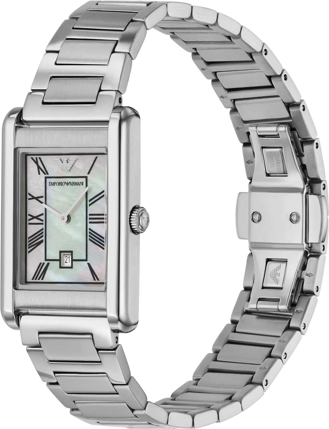 Мужские наручные часы. Прямоугольный стальной корпус. Перламутровый циферблат с метками в виде римских цифр. Окошко даты находится в положении 6 часов. Рифленая заводная головка. Стальной браслет с раскладывающейся застежкой.