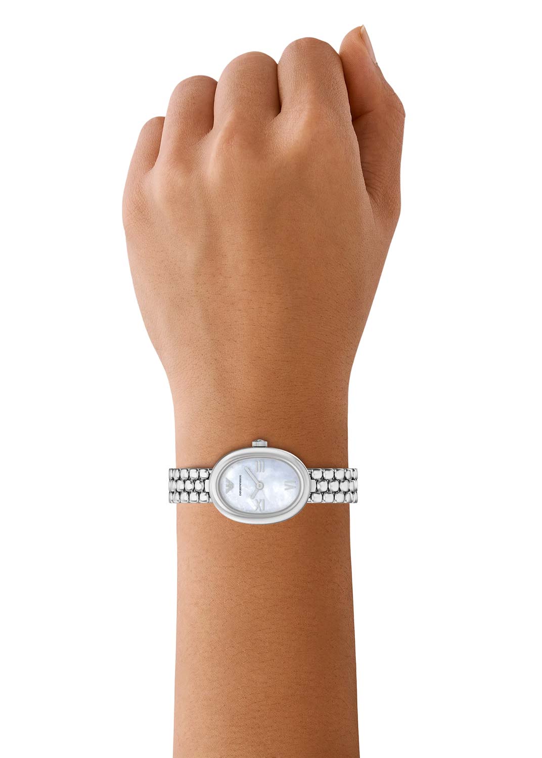 Sinfonia. Женские наручные часы. Овальный корпус из нержавеющей стали. Перламутровый циферблат с метками в виде римских цифр. Закругленные прямоугольные стрелки в стиле Baton. Рифленая заводная головка. Стальной браслет с раскладывающейся застежкой.