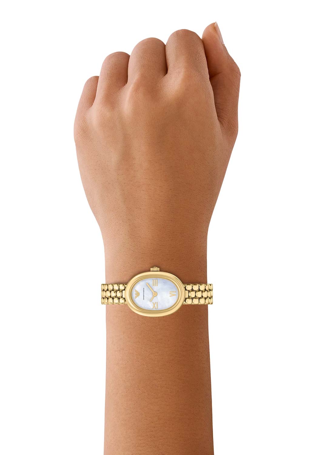 Sinfonia. Женские наручные часы. Овальный корпус из нержавеющей стали. Перламутровый циферблат с метками в виде римских цифр. Закругленные прямоугольные стрелки в стиле Baton. Рифленая заводная головка. Стальной браслет с раскладывающейся застежкой.