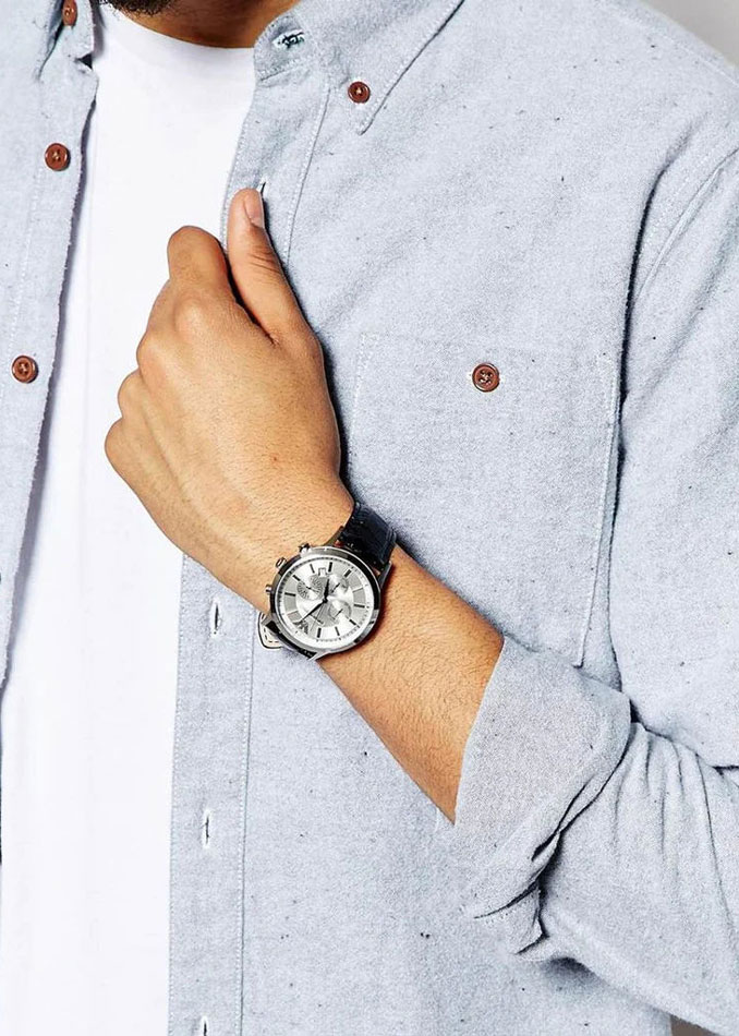 Мужские часы-хронограф Renato с секундомером. 12-ти и 24-х часовой формат времени. Круглый корпус из нержавеющей стали. Метки в виде штрихов. Окошко даты находится между отметками 4 и 5 часов. Рифленая заводная головка. Кожаный ремешок с классической застежкой.