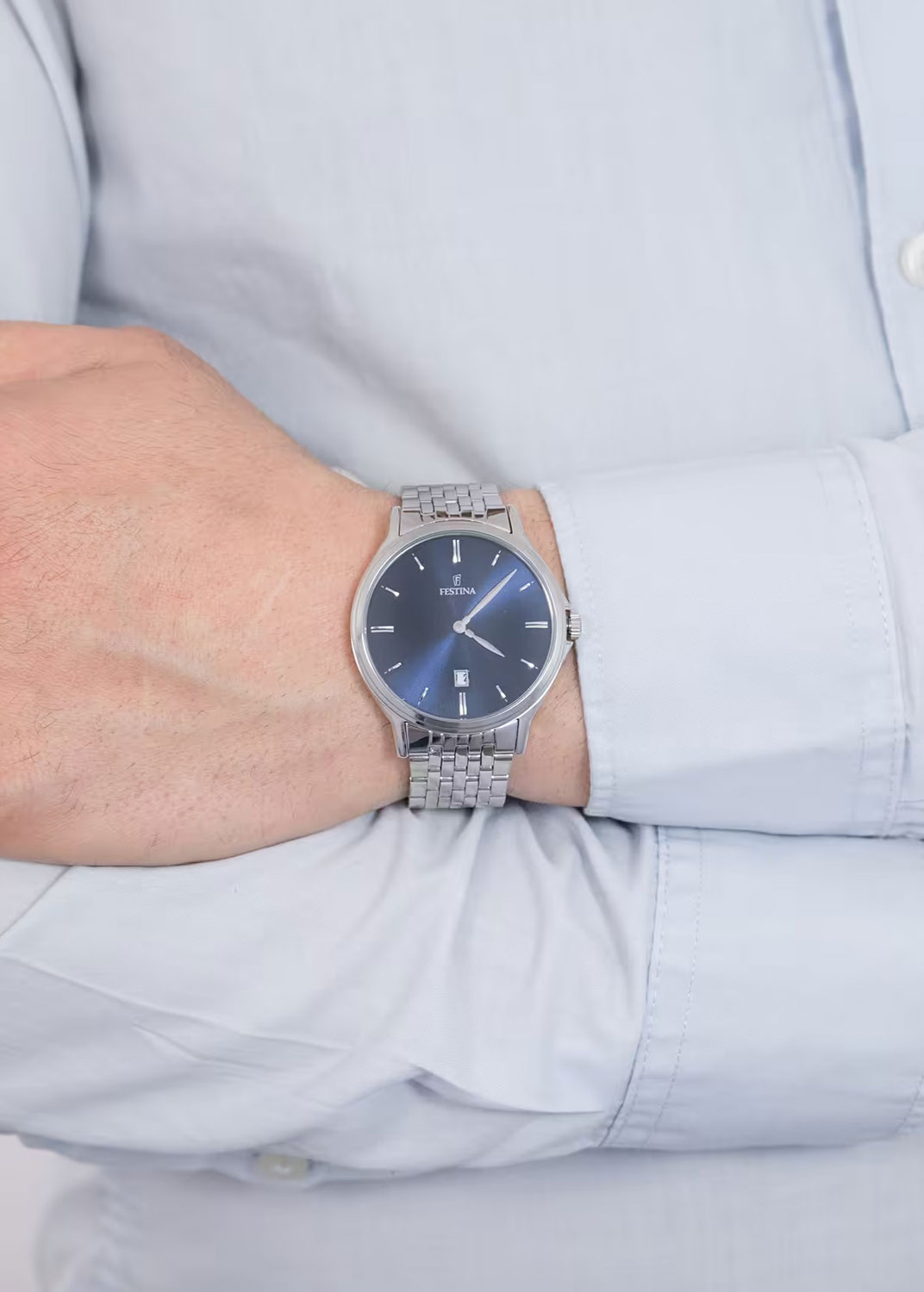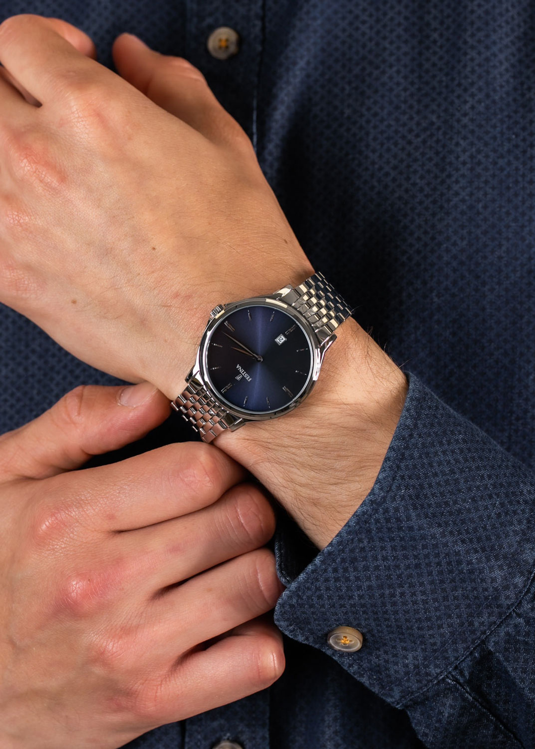 Классические наручные мужские часы. Круглый корпус из нержавеющей стали. Кварцевый механизм. Циферблат выполнен по технологии Sunray (солнечные лучи). Накладные метки в виде штрихов. Окошко даты находится в положении 6 часов. Листовидные стрелки в стиле Feuille.