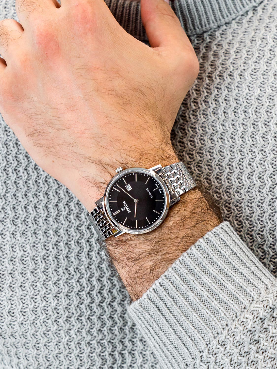 Благодаря своей эстетике - эти классические часы станут незаменимым аксессуаром для мужчин, предпочитающих классику. Мужские наручные часы Classic. Круглый стальной корпус. Циферблат выполнен по технологии Sunray (солнечные лучи). Метки в виде штрихов. Две стрелки. Окошко даты. Сапфировое стекло. Рифленая заводная головка. Браслет с раскладывающейся застежкой.