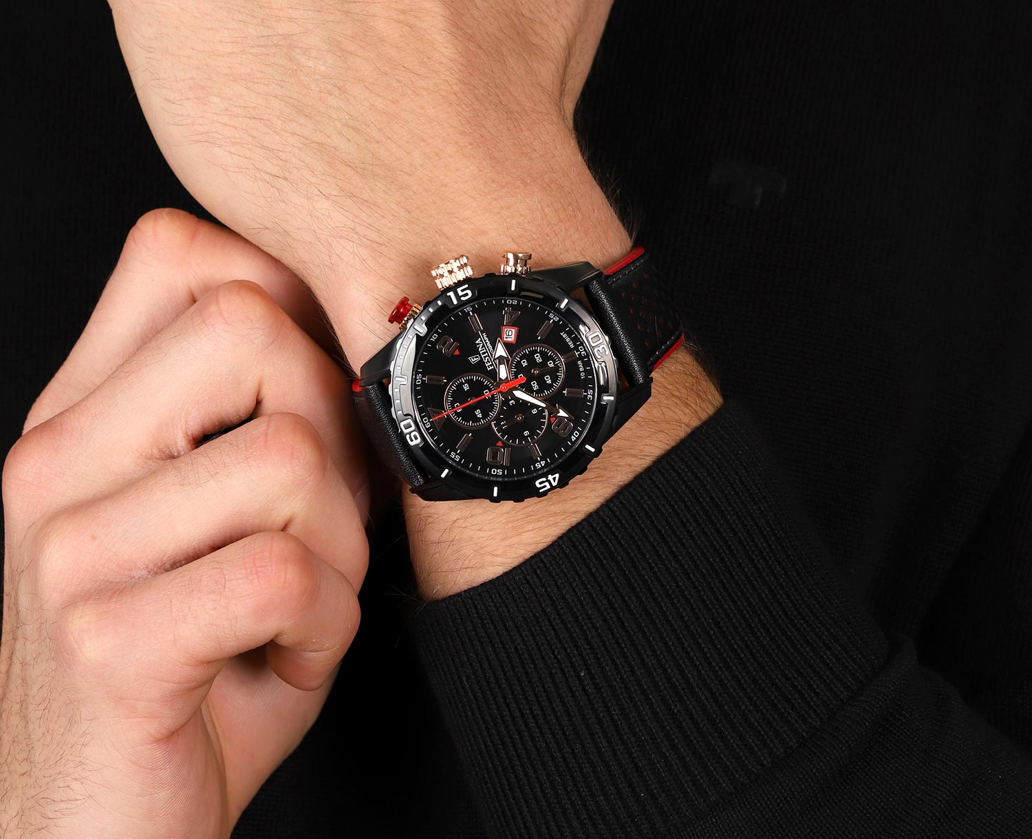 Удобные мужские часы на кожаном ремешке и дополнительными функциями станут отличным дополнением повседневного стиля одежды. Chrono Sport. Часы-хронограф с секундомером. Метки в виде штрихов и арабских цифр. Окошко даты находится в положении 4 часа. Ремешок с красной окантовкой и классической застежкой.
