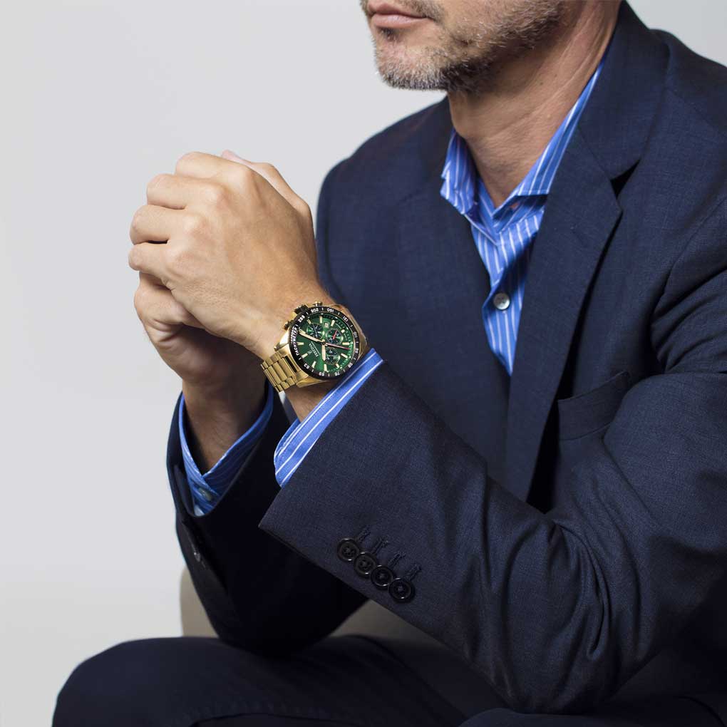 Модный хронограф станет стильным аксессуаром и верным помощником для любого мужчины. Timeless Chronograph. Часы-хронограф с секундомером и тахиметром. Циферблат выполнен по технологии Sunray (солнечные лучи). Метки в виде штрихов. Окошко даты находится в положении между 4 и 5 часов. Рифленая заводная головка с защитой. Стальной браслет с раскладывающейся застежкой. Застежка с системой блокировки.